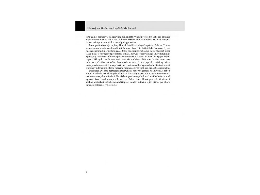 Kniha se zabývá aktuálním problémem bolesti zad, který je spojen se západním způsobem života. Zaměřuje se na hluboký stabilizační systém páteře (HSSP) a jeho vztah k prevenci a léčbě bolesti zad. Autor přináší objektivní pohled na problematiku a spojuje vědecké poznatky s praktickými aplikacemi. Kniha obsahuje detailní popisy jednotlivých svalů a zkoumá jejich roli v kontextu zdraví páteře. Pozornost je zaměřena na zdravé jedince, osoby s bolestí zad a sportovce.