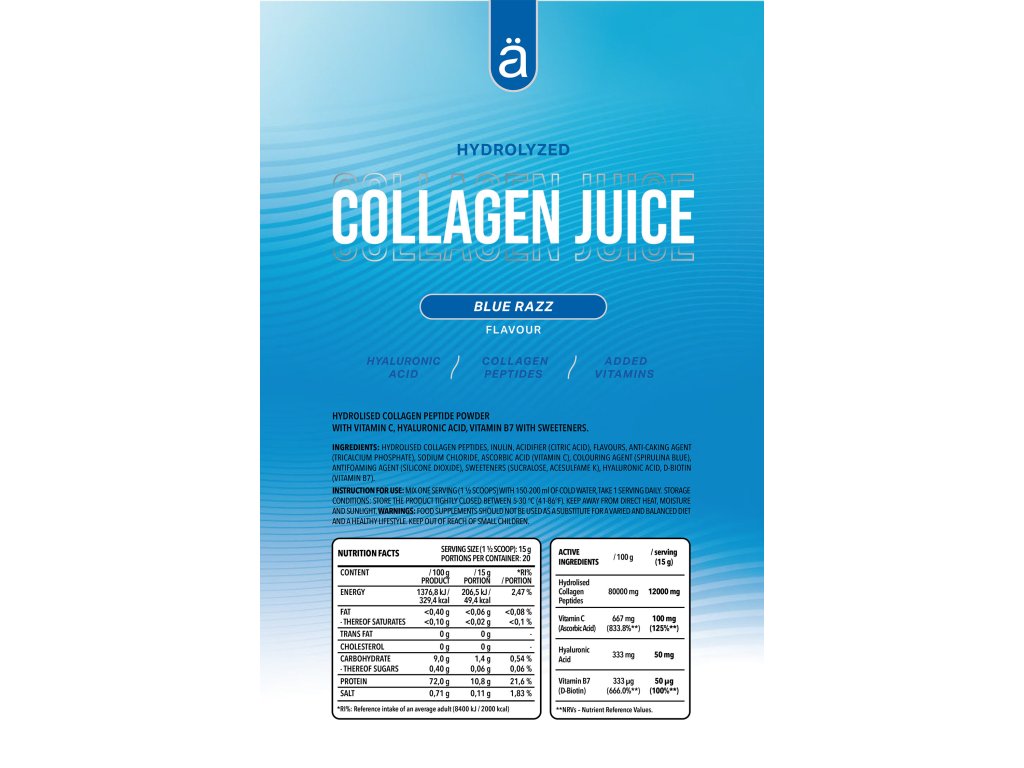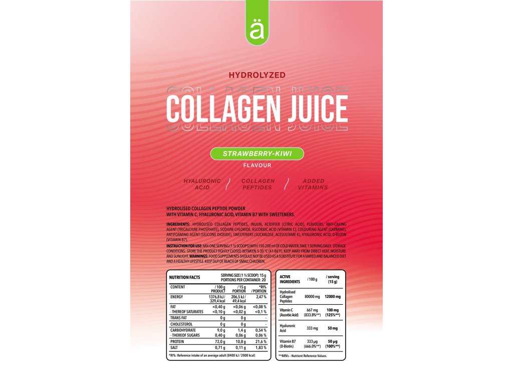 Kolagenový džus je navržen tak, aby podporoval celkové zdraví, krásu a pohodu, a snadno jej zařadíte do svého každodenního režimu, čímž pohodlně podpoříte zdraví své pokožky, vlasů a kloubů.