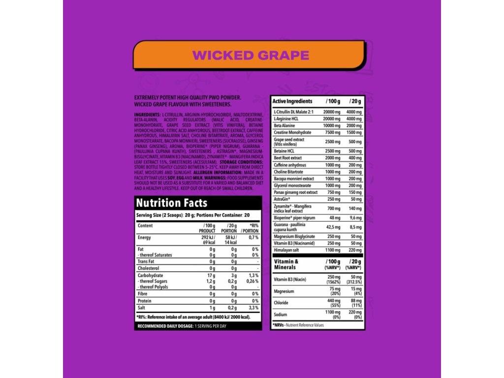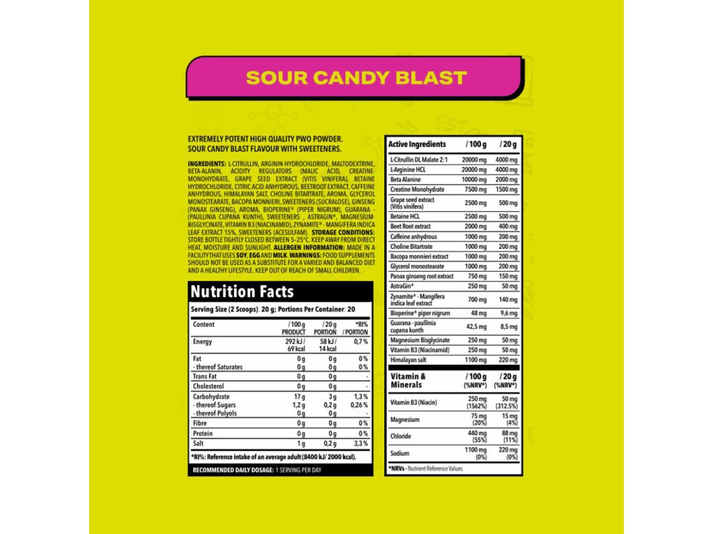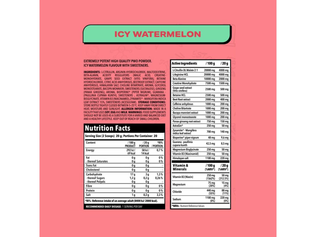 Chcete opravdu podat maximální výkon při svém tréninku a hledáte ten extra náboj síly, soustředění a napumpování? Nano Supps CFR Pre-Workout vám to přesně přináší: S 200 mg kofeinu a profesionální směsí 4 000 mg L-citrulinu, 2 000 mg beta-alaninu, kreatinu, AstraGin®, Zynamite® a BioPerine® se budete posouvat ještě dál v každé sérii a zůstanete mentálně ostří od první odměrky až po poslední opakování.Upozornění