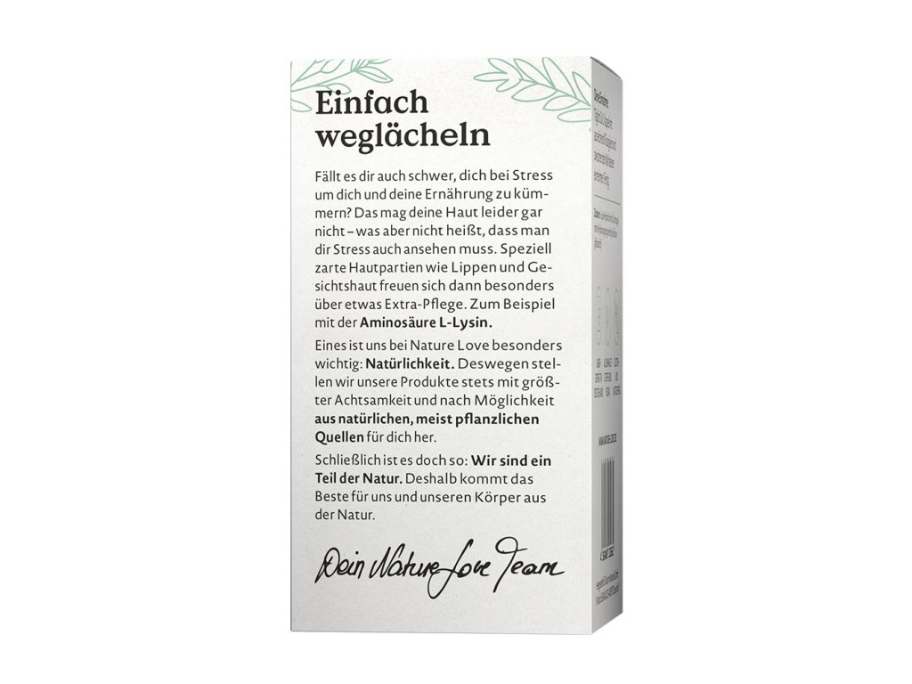 Máte také potíže starat se o sebe a svou stravu, když jste ve stresu? Bohužel, vaší pokožce se to vůbec nelíbí — ale to neznamená, že musíte být ve stresu vy. Citlivé oblasti pokožky, jako jsou rty a pleť obličeje, ocení trochu extra péče. Například pomocí aminokyseliny L-lysin.- 1 000 mg L-lysin HCL (hydrochlorid), z toho 800 mg čistého L-lysinu denně (2 kapsle)