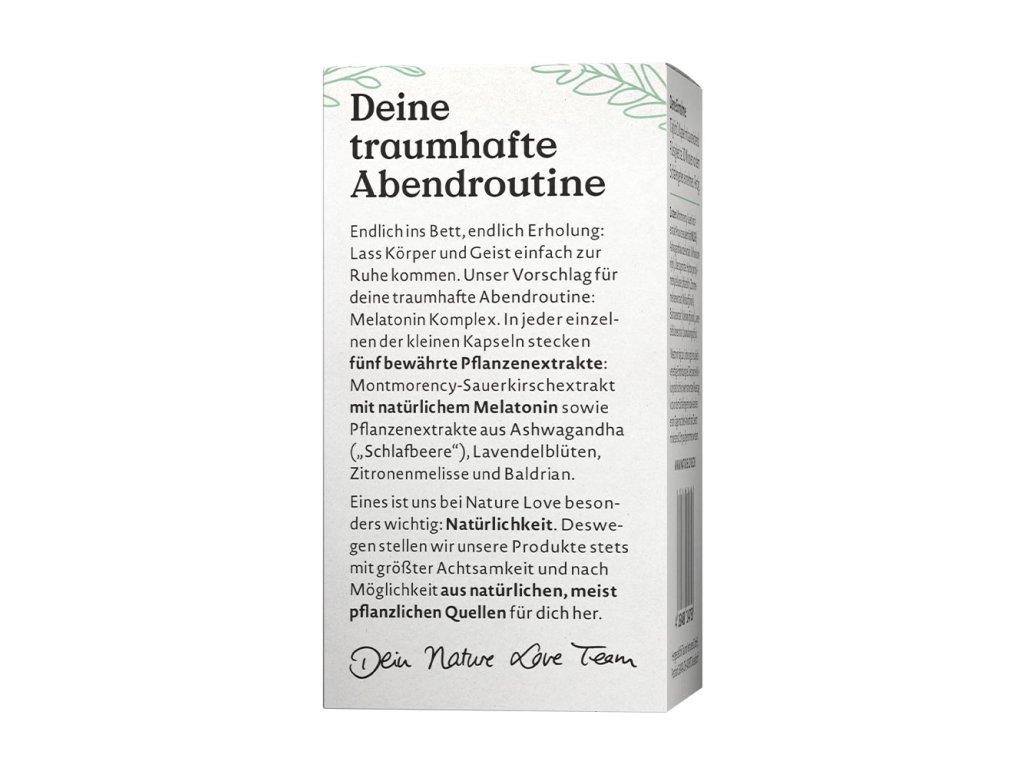 Konečně v posteli, konečně trochu odpočinku: nechte tělo i mysl jednoduše relaxovat. Náš tip pro váš večerní rituál: Melatonin Complex. Každá z malých kapslí obsahuje pět osvědčených a speciálně kombinovaných rostlinných extraktů, především pravý extrakt z višní Montmorency s přírodním melatoninem. Melatonin znáte jako tělu vlastní „spánkový hormon“ a jako společníka vašich spánkových a bdělých cyklů – i v případě, že je váš rytmus narušen, například při pásmové nemoci. K tomu jsou přidány jemná ašvaganda („spánková bobule“), stejně jako květy levandule, meduňka a kozlík lékařský. Tak tedy, dobrou noc.Upozornění