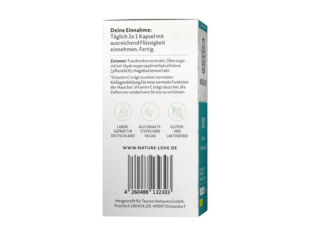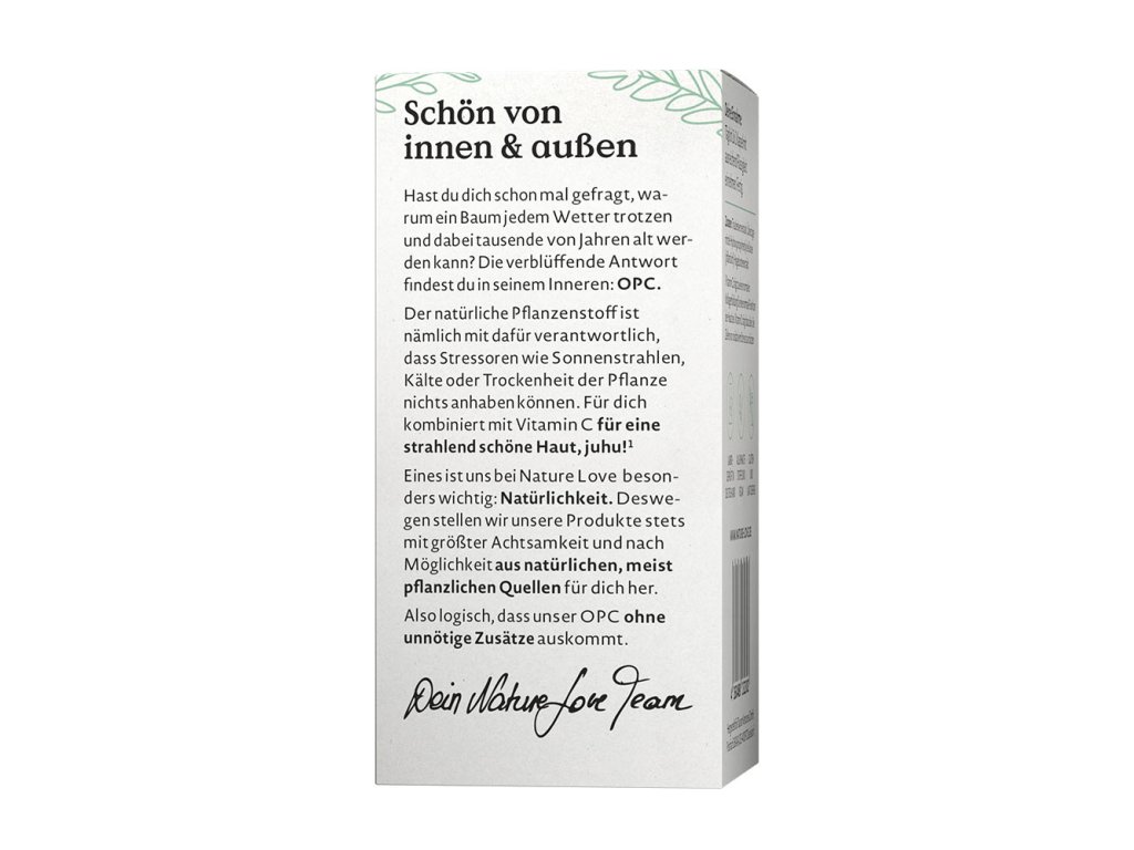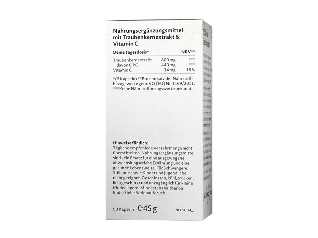 Co mají OPC a vitamín C společného? Spojené tvoří nepřekonatelný tým pro zářivou pleť a růžový vzhled. Naše OPC získáváme ze semínek hroznů z krásné Francie, kde probíhá i extrakce za nízkých teplot pomocí vody a alkoholu. Pro 55% obsah OPC – a také pro vysokou biologickou dostupnost s vysokou dávkou 440 mg denně: veganské, bez lepku, bez laktózy, non-GMO a bez nežádoucích přísad!- Vysoká dávka s 440 mg OPC na denní dávku (55% obsah OPC) při užití 2 kapslí denně