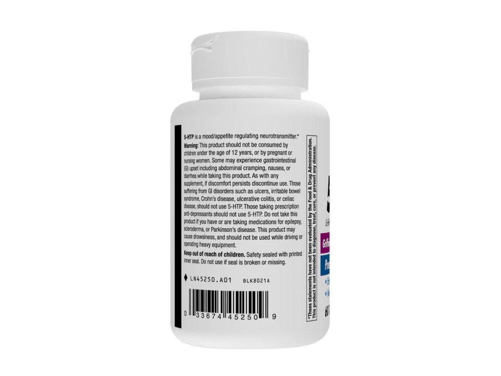 Neužívejte tento přípravek, pokud je vám méně než 12 let nebo pokud jste těhotná či kojíte. Neužívejte tento přípravek, pokud máte nebo užíváte léky na epilepsii, sklerodermii nebo Parkinsonovu chorobu nebo pokud užíváte antidepresiva. Pokud trpíte gastrointestinálními poruchami, jako jsou vředy, syndrom dráždivého tračníku, Crohnova choroba, ulcerózní kolitida nebo celiakie, neměli byste 5-HTP užívat. Pokud užíváte nějaké léky, poraďte se před použitím s lékařem. U některých osob se mohou při užívání tohoto přípravku vyskytnout gastrointestinální potíže, včetně křečí v břiše, nevolnosti nebo průjmu. Pokud potíže přetrvávají, přestaňte přípravek používat. Tento přípravek může způsobit ospalost; během užívání tohoto přípravku neřiďte a neobsluhujte těžké strojeUchovávejte mimo dosah dětí. Bezpečnostní uzávěr s vnitřním těsněním. Nepoužívejte, pokud je těsnění porušené nebo chybí. Uchovávejte je pevně uzavřené. Skladujte při pokojové teplotě. Vyhněte se nadměrnému teplu a přímému slunečnímu záření.
