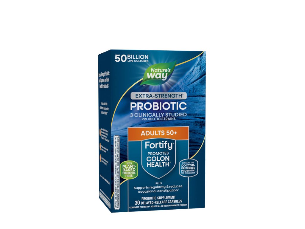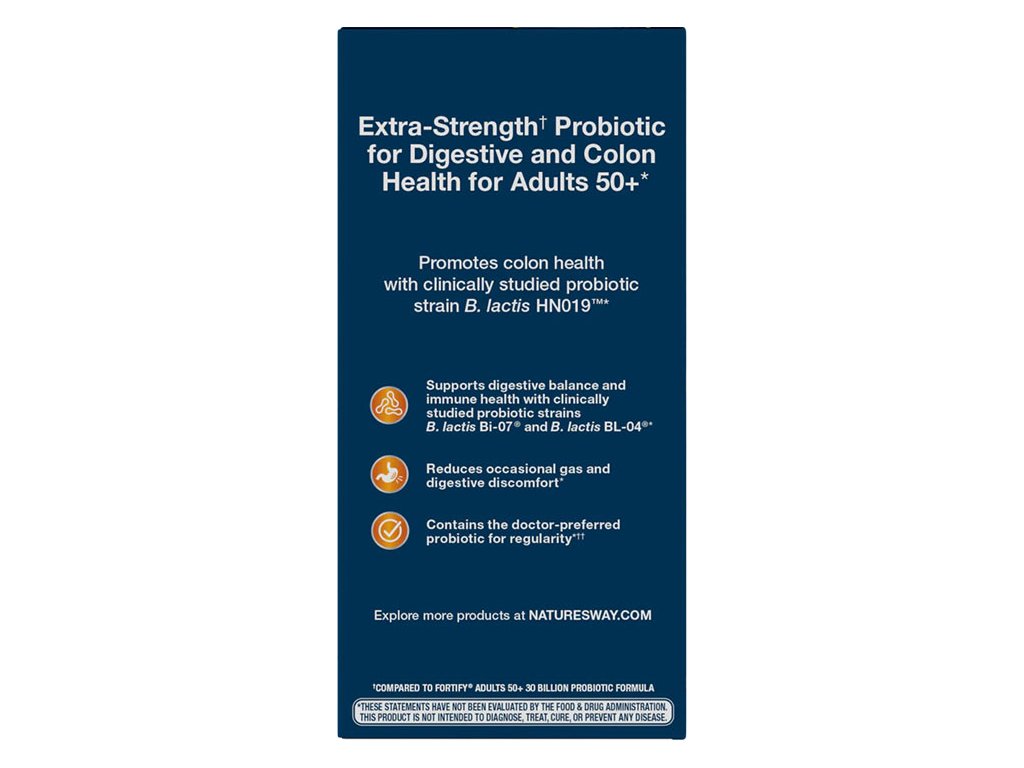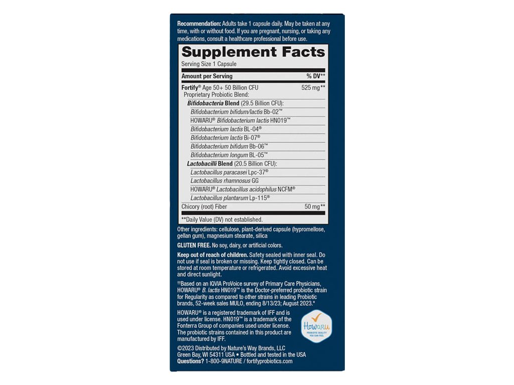 Toto denní probiotikum pro dospělé 50+ podporuje zdraví trávicího traktu, imunitního systému a tlustého střeva. Je vyroben z 11 různých probiotických kmenů, včetně 3 klinicky studovaných probiotických kmenů, a obsahuje 50 miliard živých probiotických kultur v jedné kapsli a prebiotika, zdroj potravy pro dobré bakterie. Snižuje občasnou zácpu, plynatost a zažívací potíže a obsahuje HOWARU® B. lactis HN019™, lékařem doporučované probiotikum pro pravidelnost. Navíc nevyžadují chlazení, takže si je můžete vzít kamkoli a kdykoli.Upozornění