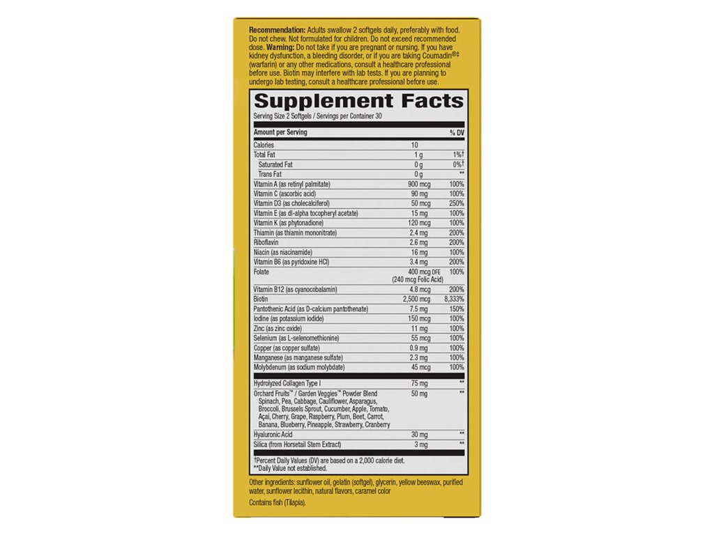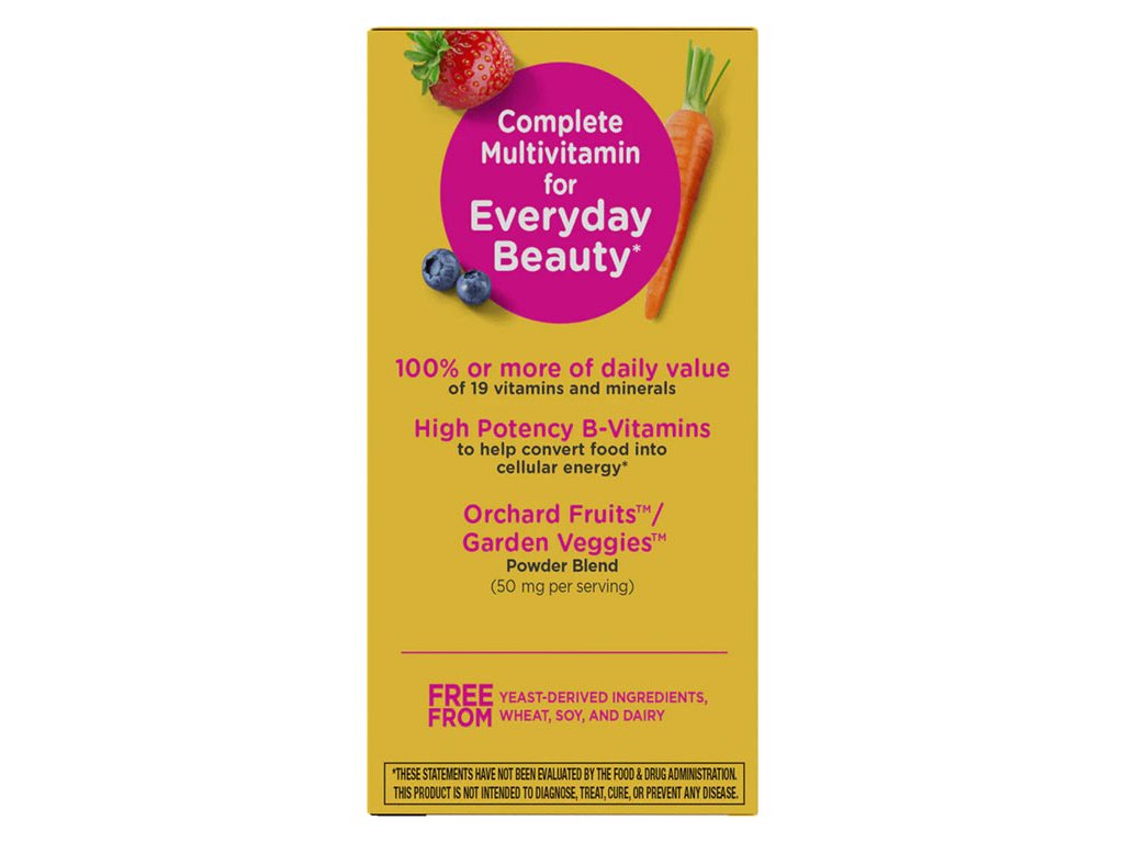 Kompletní multivitamín pro každodenní krásu. 100 % nebo více denní hodnoty 19 vitamínů a minerálů. Vysoce účinné vitaminy skupiny B pomáhají přeměňovat potravu na buněčnou energii. S kolagenem typu I, biotinem, oxidem křemičitým a kyselinou hyaluronovou.Upozornění