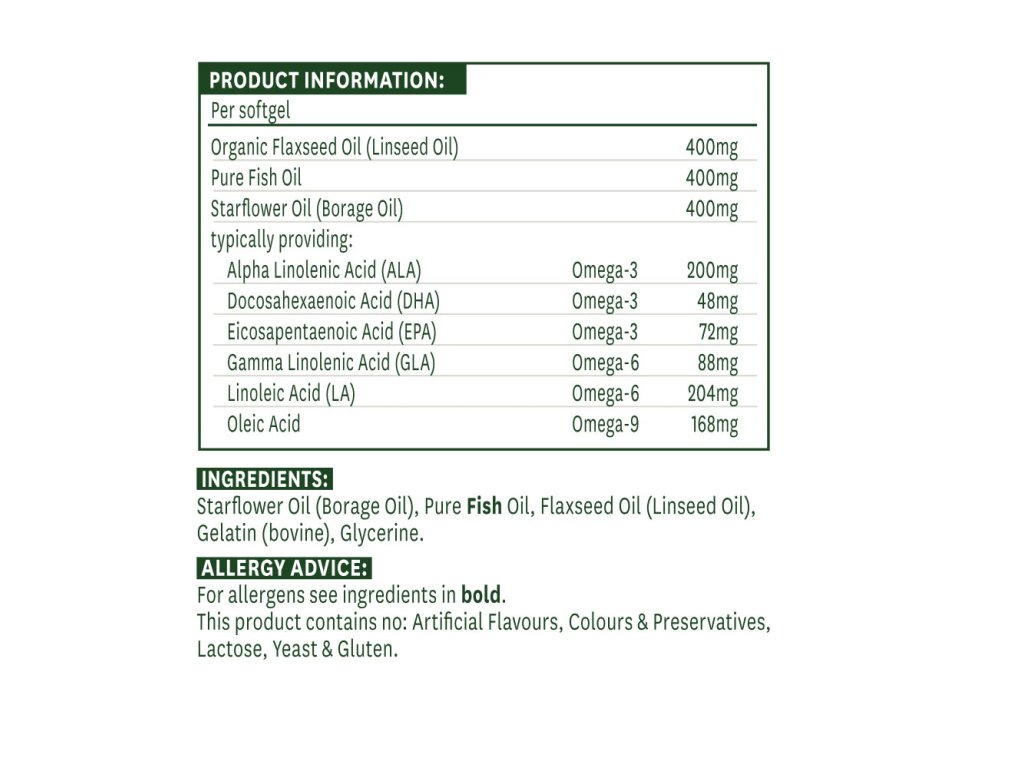 Nárůst potravin "bez tuku" nebo "s méně než 5 % tuku" se objevil kvůli negativním konotacím spojeným s příjmem tuku ve stravě. Přestože je pravda, že by naše strava neměla obsahovat více než 30 % kalorií v podobě tuků, existují určité tuky, které naše tělo potřebuje k udržení dobrého zdraví. Tyto esenciální mastné kyseliny (EFA), jako jsou omega 3 a 6, si naše tělo nedokáže vytvořit samo. Omega-3 a omega-6 jsou klíčové složky nervových buněk, buněčných membrán a prostaglandinů (látek podobných hormonům). V mnoha moderních stravovacích návycích je těchto mastných kyselin nedostatek, a proto se mnozí lidé rozhodnou je doplnitNaše kompletní EFA pochází z malých tučných ryb: ančoviček, sardinek a sardinek z jižního Pacifiku. Používáme pouze rybí olej, který byl molekulárně destilován pro dosažení čistoty, a je vyvážen za studena lisovaným lněným olejem a za studena lisovaným olejem z hvězdicových semínek. Naše pečlivě vyvinuté složení přispívá k normální funkci srdce a příznivého účinku se dosahuje při denním příjmu 3 softgelů. DHA z našeho rybího oleje přispívá také k udržení normální funkce mozku a zraku.