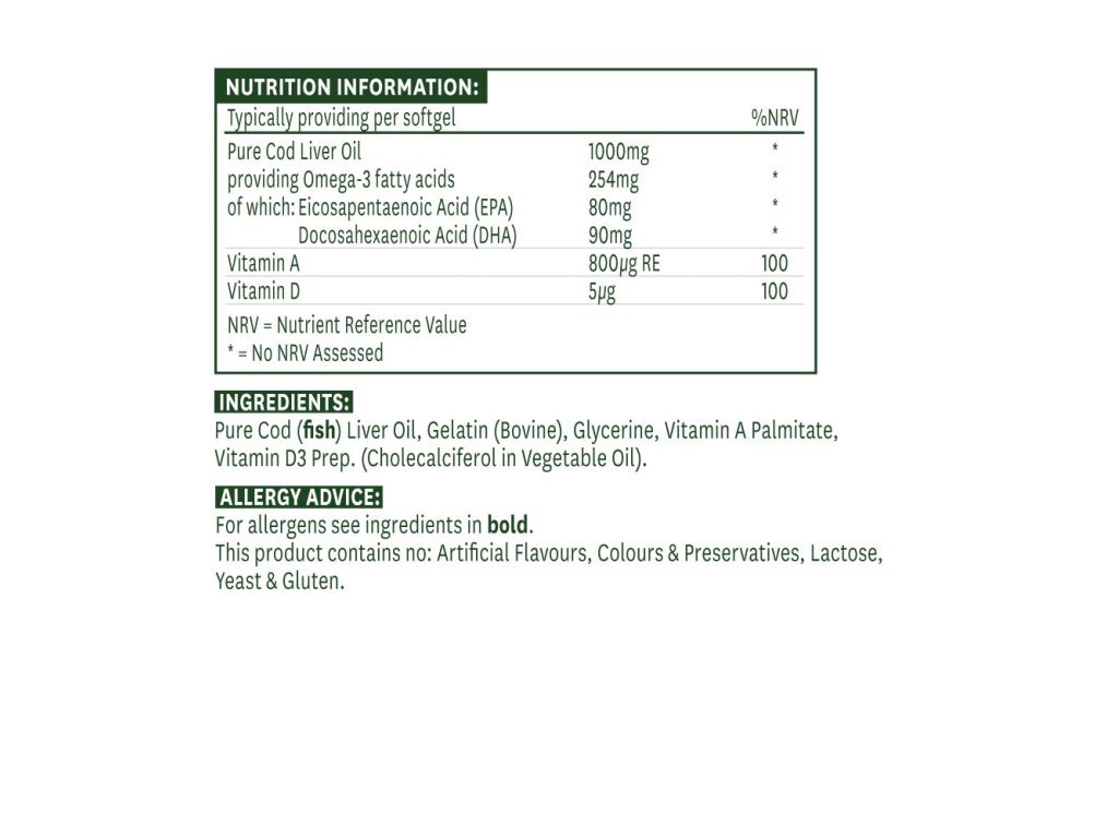 Každá 1000mg kapsle našeho vysoce účinného oleje z tresčích jater je zdrojem vitaminu A, vitaminu D a omega-3 mastných kyselin včetně DHA a EPAVitamin D přispívá k udržení normální hladiny vápníku v krvi, normální funkci imunitního systému, normální funkci svalů a k udržení normálního stavu zubů, zatímco vitamin A přispívá k normálnímu stavu pokožky, normálnímu stavu zraku a normální funkci imunitního systému. Podporuje také funkci sliznic, které se nacházejí v celém těle, včetně trávicího systému a močových cest.