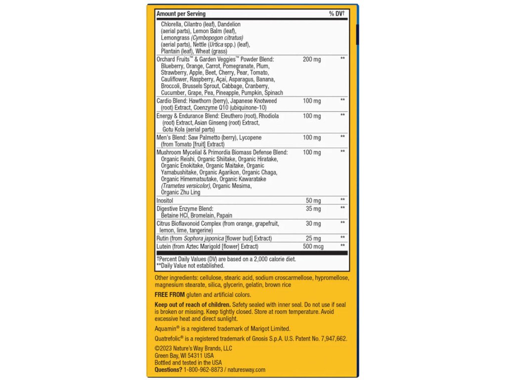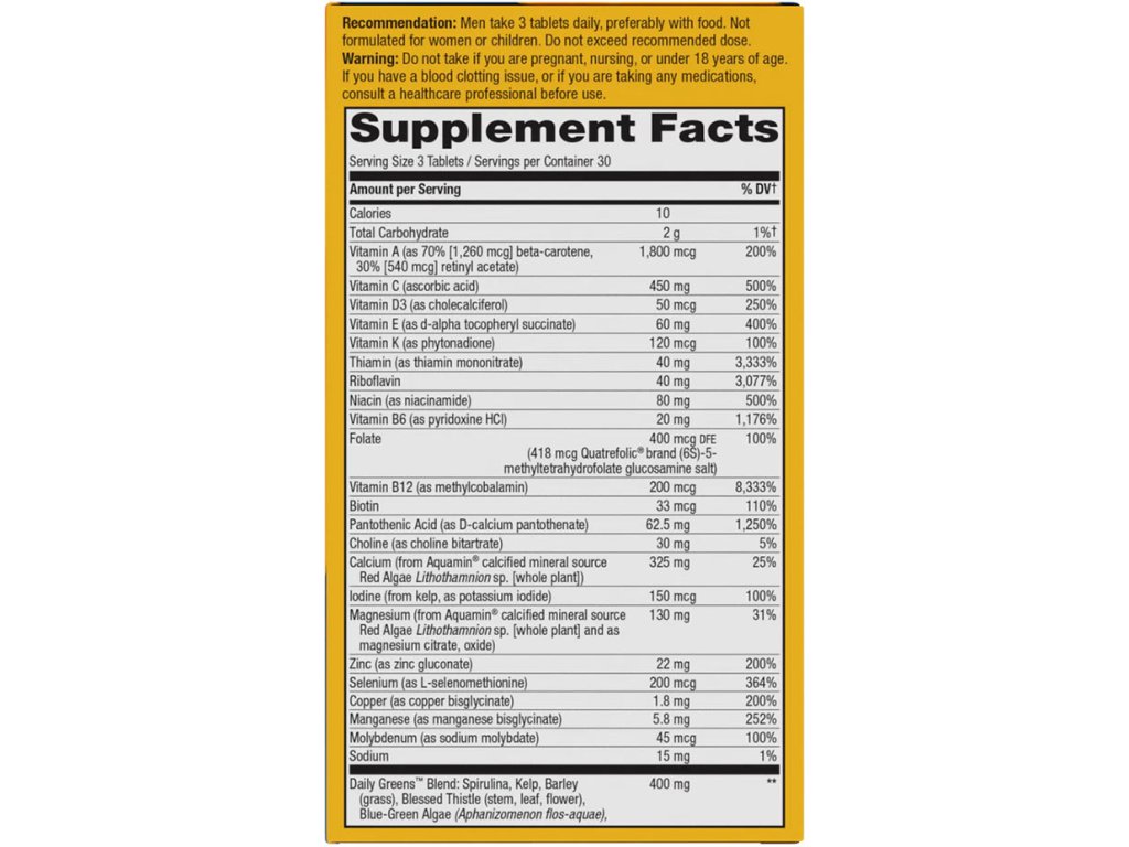 Zvyšte hlasitost svého denního multivitamínu. Žije! Max3 Daily je nejsilnější multivitamín pro muže, který nabízíme, obsahuje nejvyšší množství komplexu vitaminů skupiny B pro přeměnu potravy na buněčnou energii a speciální práškové směsi na bázi potravin, jako jsou Energy & Endurance, Cardio a Digestive Enzyme. Max3 je vyvážen tak, aby podporoval zdraví kostí, očí, srdce, imunitního systému a svalů mužů a také energetický metabolismus.