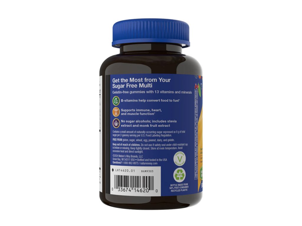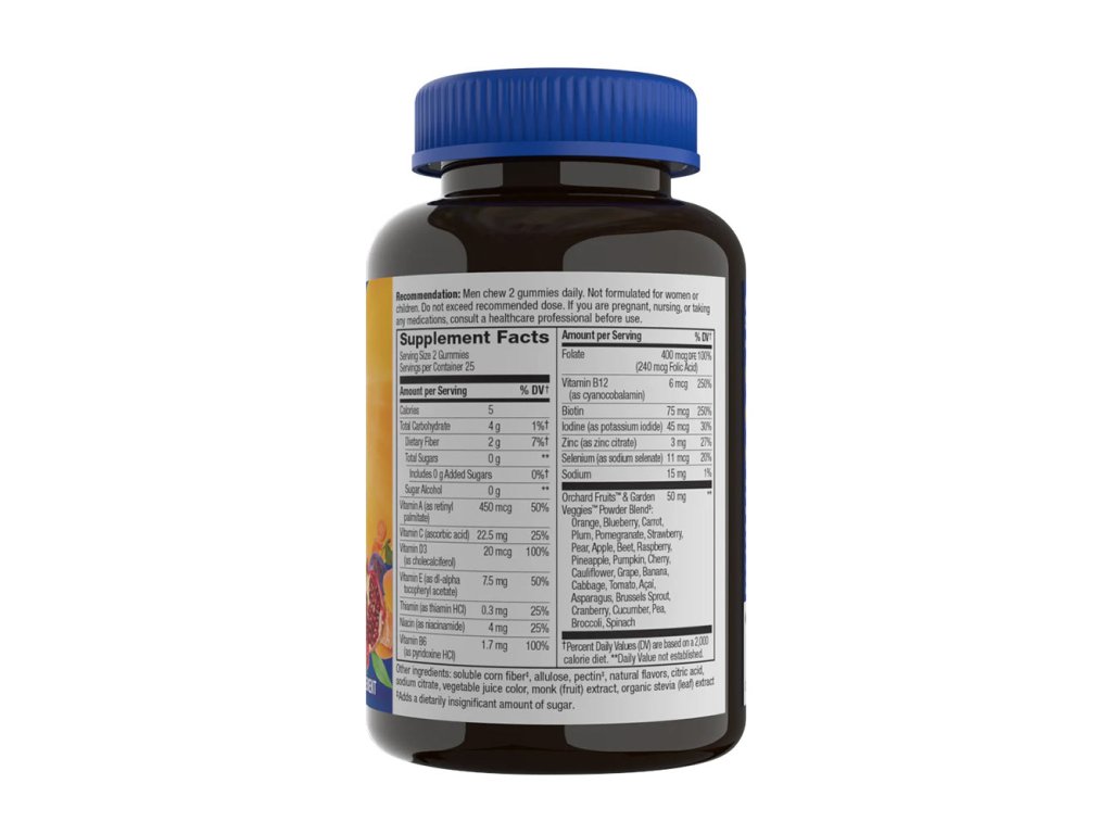 Lahodné gumové bonbony s nulovým obsahem cukru. Žije! Pánské gumové multivitamíny Zero Sugar obsahují 13 vitaminů a minerálů včetně vitaminů skupiny B, které pomáhají přeměňovat potravu na palivo. Denní dávka podporuje energetický metabolismus, funkci svalů a další. Obsahuje malé množství přirozeně se vyskytujícího cukru, vyjádřeno jako 0 g celkového cukru v jedné porci 2 žvýkaček na USA. Nařízení o označování potravin. Žádné cukerné alkoholy. Vyrobeno z rostlinných sladidel včetně extraktu ze stévie a extraktu z mnišského ovoce.Upozornění
