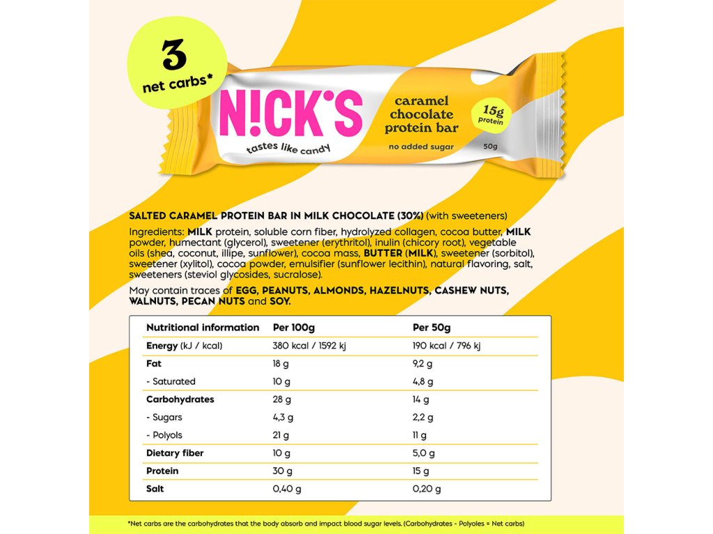 Stačí jedno sousto a víte, že jste našli toho pravého! V této lahodné proteinové tyčince se setkává krémový karamel s bohatou čokoládou. Bez lepku, bez přidaného cukru, s 30% obsahem bílkovin. Bez palmového oleje.Upozornění
