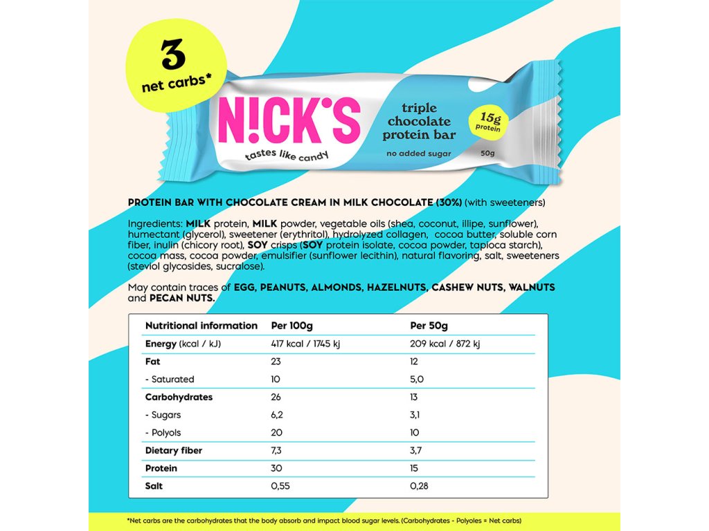 Pokud jste milovníci čokolády, ale přesto jíte zdravě, je pro vás Nickova trojitá čokoládová proteinová tyčinka jako stvořená! Trojitá čokoláda, trojité potěšení. Neobsahuje lepek, je vyroben bez přidaného cukru a obsahuje 30 % bílkovin. Bez palmového oleje.Upozornění