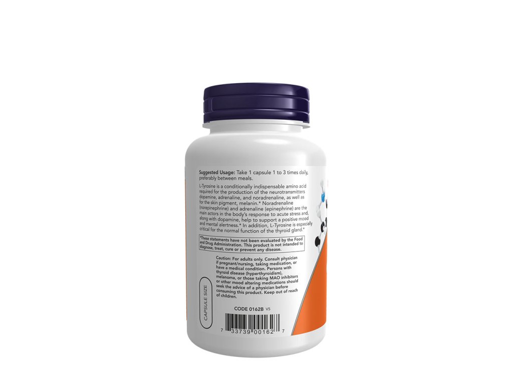 L-Tyrosin je podmíněně nepostradatelná aminokyselina potřebná pro tvorbu neurotransmiterů dopaminu, adrenalinu a noradrenalinu a kožního barviva melaninu. Noradrenalin (noradrenalin) a adrenalin (adrenalin) jsou hlavními aktéry reakce organismu na akutní stres a spolu s dopaminem přispívají k pozitivní náladě a duševní bdělosti. Kromě toho je L-tyrosin obzvláště důležitý pro normální funkci štítné žlázy. L-Tyrosin použitý v tomto produktu je farmaceutické kvality