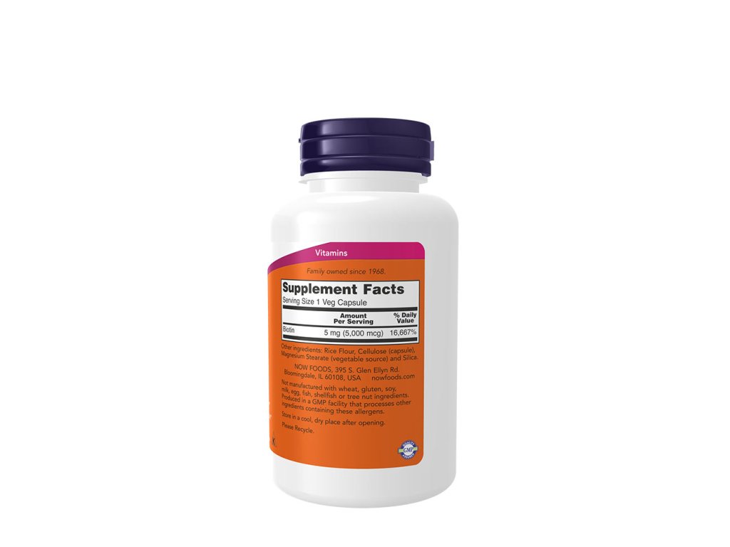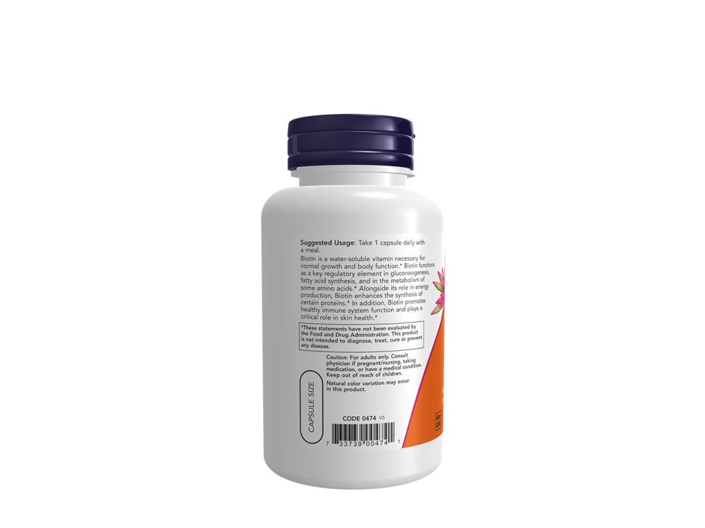 NOW® Biotin je ve vodě rozpustný vitamin nezbytný pro normální růst a funkci organismu. Biotin funguje jako klíčový regulační prvek v glukoneogenezi, syntéze mastných kyselin a v metabolismu některých aminokyselin. Biotin se podílí na tvorbě energie a podporuje syntézu některých bílkovin. Kromě toho biotin podporuje zdravou funkci imunitního systému a hraje zásadní roli ve zdraví pokožky