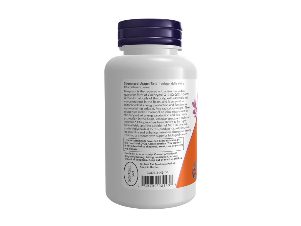 Ubichinol je redukovaná a aktivní forma koenzymu Q10 (CoQ10), která zháší volné radikály. CoQ10 se nachází ve všech tělesných buňkách, obzvláště vysoká koncentrace je v srdci, a je nezbytný pro produkci energie v mitochondriích a funguje jako silný, v tucích rozpustný, zachycovač volných radikálů. Díky těmto vlastnostem je ubichinol ideálním doplňkem pro podporu tvorby energie a ochranu před volnými radikály v srdci, cévních strukturách, mozku a neuronech. Bylo prokázáno, že ubichinol je vysoce biologicky dostupný, a přidání MCT oleje (triglyceridů se středně dlouhým řetězcem) do tohoto produktu přirozeně zlepšuje jeho rozpustnost a zvyšuje střevní absorpci, čímž vytváří produkt s vynikající biologickou hodnotou