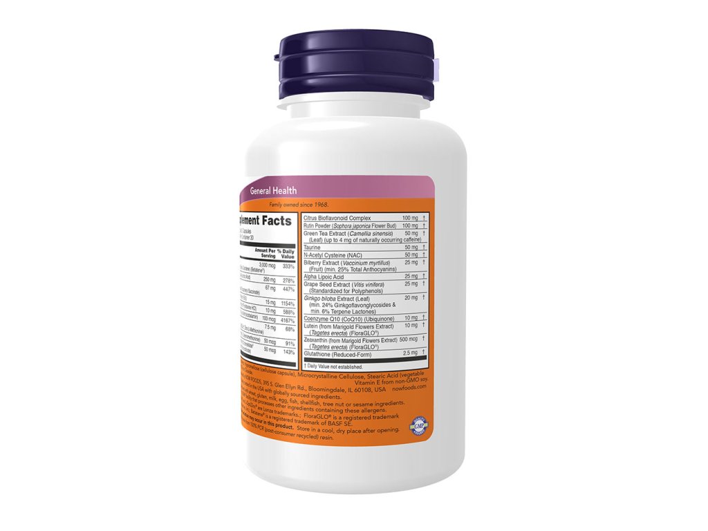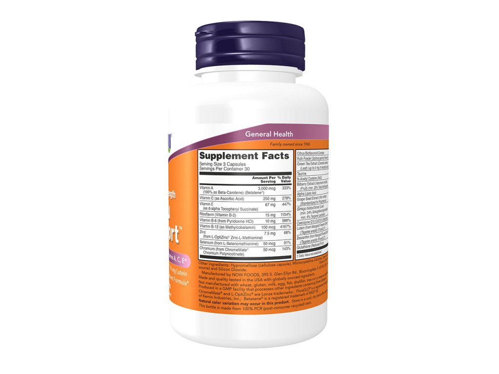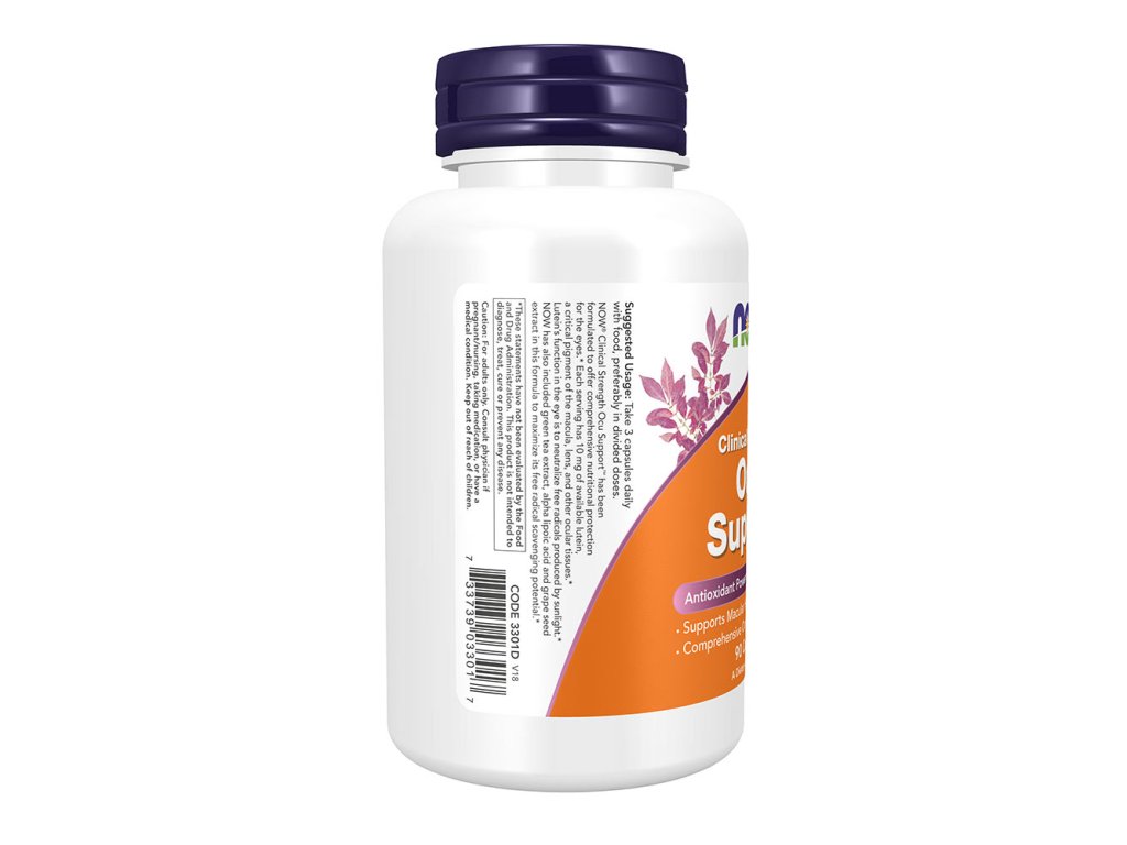 Složení NOW® Clinical Strength Ocu Support™ bylo vyvinuto tak, aby poskytovalo komplexní výživovou ochranu očí. Každá dávka obsahuje 10 mg dostupného luteinu, který je důležitým pigmentem makuly, čočky a dalších očních tkání. Funkcí luteinu v oku je neutralizovat volné radikály vznikající při slunečním záření. Společnost NOW do tohoto přípravku zahrnula také extrakt ze zeleného čaje, kyselinu alfa-lipoovou a extrakt z hroznových semen, aby maximalizovala jeho potenciál pro odstraňování volných radikálů.