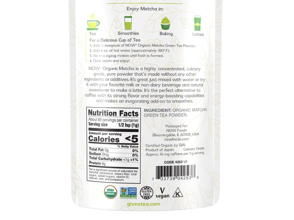 NOW® Organic Matcha je vysoce koncentrovaný, čistý prášek kulinářské kvality, který se vyrábí bez jakýchkoli dalších přísad nebo aditiv. Je skvělý jen tak smíchaný s vodou nebo si z něj můžete připravit latté s oblíbeným mlékem či nemléčným nápojem a přírodním sladidlem. Díky své výrazné chuti a schopnostem dodávat energii je dokonalou alternativou kávy a je povzbuzujícím doplňkem koktejlů.