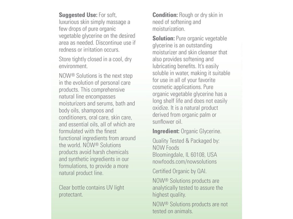 Řešení: NOW® Pure Organic Vegetable Glycerin je vynikající hydratační a čisticí prostředek na pleť, který má také zvláčňující a promašťující účinky. Je snadno rozpustný ve vodě, takže je vhodný pro použití ve všech vašich oblíbených kosmetických aplikacích. Čistý organický rostlinný glycerin má dlouhou trvanlivost a snadno neoxiduje. Jedná se o přírodní produkt získaný z organického palmového nebo slunečnicového oleje