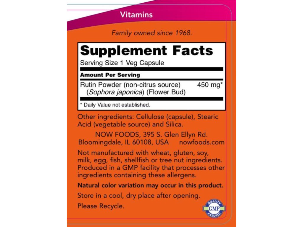 Rutin je bioflavonoid příbuzný kvercetinu a hesperidinu, který se nachází v citrusových i necitrusových plodech a v dalších potravinách, jako je pohanka. Rutin je silným bojovníkem proti volným radikálům a je známý především pro svou roli v oblasti zdraví cév. Rutin pomáhá udržovat strukturální integritu krevních cév, jako jsou žíly a kapiláry. Vědecké studie naznačují, že může přispívat k podpoře funkce cév a zdravého krevního oběhu. NOW® Rutin je vegetariánský a pochází z jiného než citrusového zdroje.