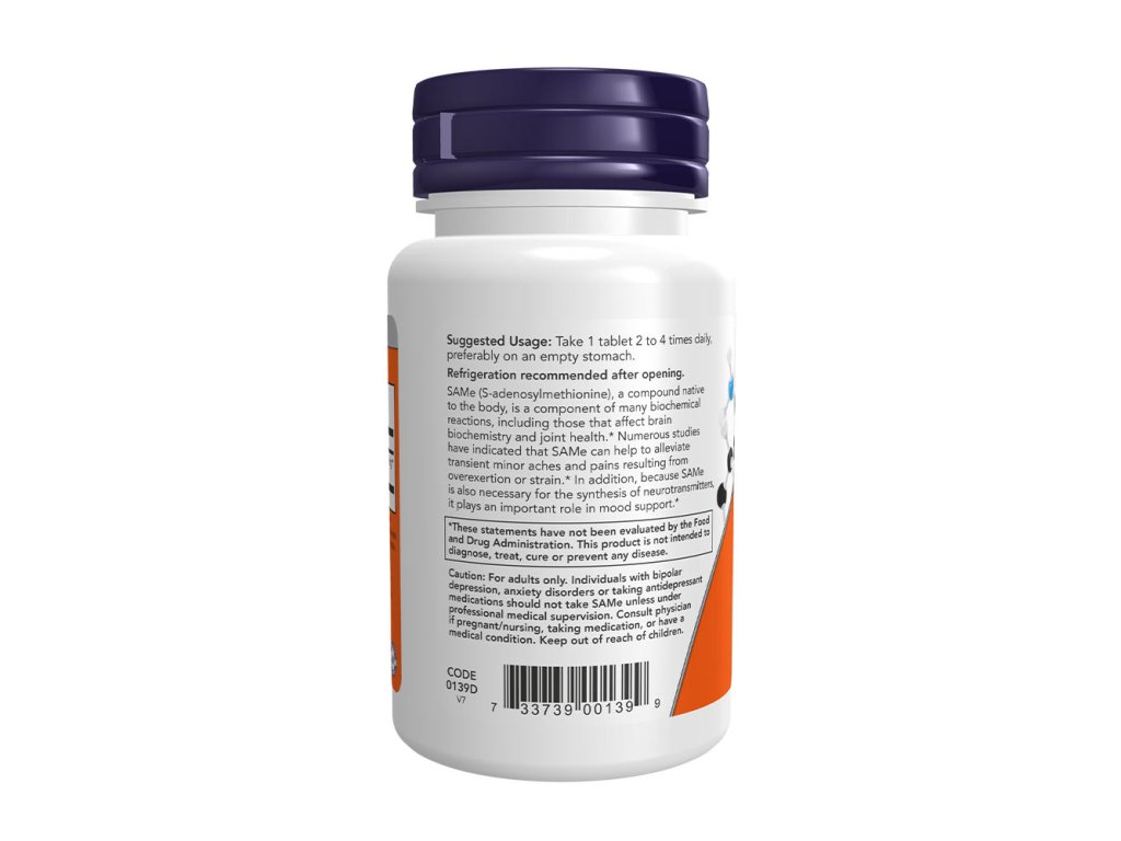 SAMe (S-adenosylmethionin), látka tělu vlastní, je součástí mnoha biochemických reakcí, včetně těch, které ovlivňují biochemii mozku a zdraví kloubů. Četné studie ukázaly, že SAMe může pomoci zmírnit přechodné drobné bolesti způsobené nadměrnou námahou nebo zátěží. Kromě toho je SAMe nezbytný pro syntézu neurotransmiterů, a proto hraje důležitou roli při podpoře nálady. NOW® SAMe je potažen enterickým obalem, díky čemuž je velmi dobře snášen a chráněn před degradací.
