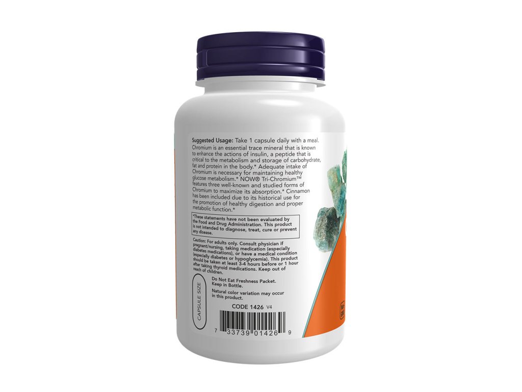 Chrom je esenciální stopový minerál, o kterém je známo, že posiluje účinek inzulinu, peptidu, který je rozhodující pro metabolismus a ukládání sacharidů, tuků a bílkovin v těle. Dostatečný příjem chromu je nezbytný pro udržení zdravého metabolismu glukózy. NOW® Tri-Chromium™ obsahuje tři dobře známé a studované formy chromu, které maximalizují jeho vstřebávání. Skořice byla do seznamu zařazena díky svému historickému využití pro podporu správné metabolické funkce.