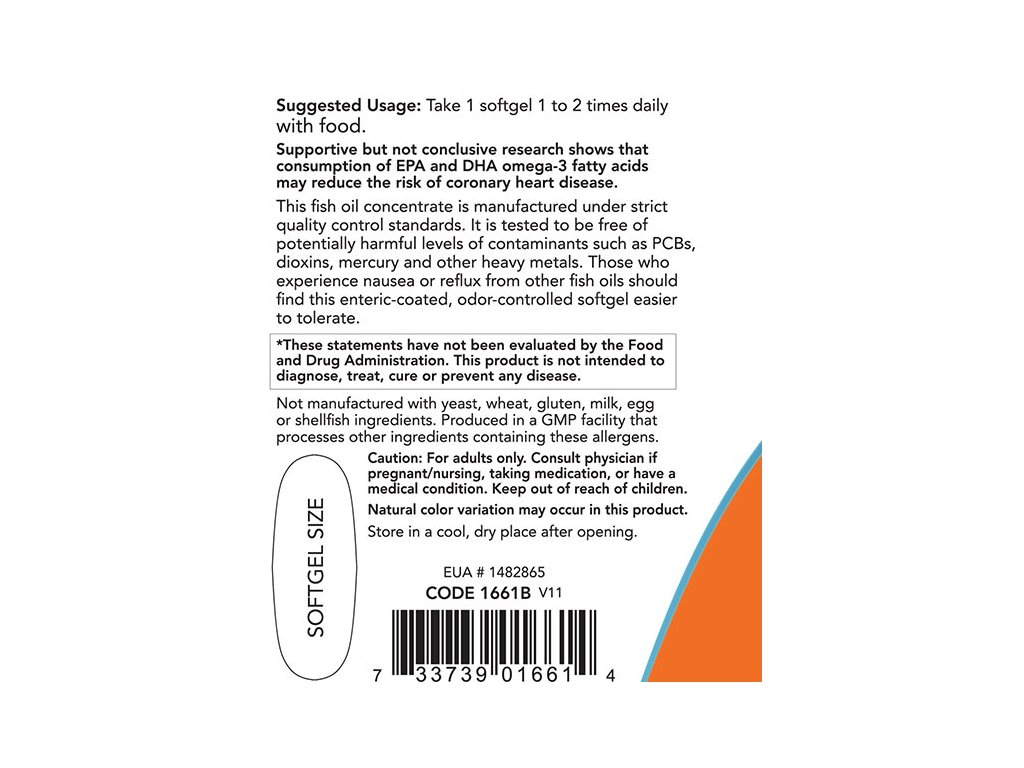 Přírodní koncentrát rybího oleje použitý v tomto softgelu je vyráběn za přísných standardů kontroly kvality. Testuje se, zda neobsahuje potenciálně škodlivé kontaminanty (tj. rtuť, těžké kovy, PCB, dioxiny a další kontaminanty). Ti, kteří pociťují nevolnost nebo reflux po jiných rybích olejích, by měli tento měkký gel s enterickým obalem a kontrolovaným zápachem lépe snášet.