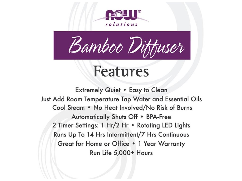 Ultrazvukový olejový difuzér NOW® Solutions Real Bamboo je atraktivní difuzér, který neobsahuje BPA a využívá vysokofrekvenční ultrazvukové elektrické vibrace k vytváření velmi jemné mlhy. Při této difuzní metodě se nepoužívá teplo, což zachovává integritu a holistické vlastnosti esenciálního oleje.