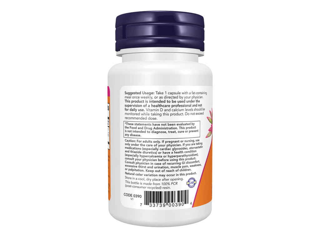 Užijte 1 kapsli s jídlem obsahujícím tuk jednou týdně, nebo podle pokynů vašeho lékaře. Tento produkt je určen k použití pod dohledem zdravotnického pracovníka a není určen pro každodenní použití. Při užívání tohoto produktu by měla být sledována hladina vitamínu D a vápníku. Nepřekračujte doporučenou dávku.Po otevření skladujte na chladném a suchém místě.