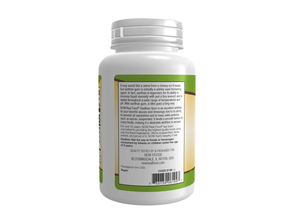 Možná to zní jako název z laciného sci-fi filmu, ale xantanová guma je ve skutečnosti široce používaným zahušťovadlem. Ve skutečnosti je xanthan legendární svou schopností zvyšovat viskozitu tekutin již při malém množství a je stabilní v širokém rozmezí teplot a pH. U xantanové gumy platí, že stačí málo. Xantanová guma NOW Real Food® je vynikajícím doplňkem vašich oblíbených omáček a dresinků díky své schopnosti zabraňovat oddělování oleje a udržovat pevné částice, jako je například koření, v suspenzi. Dodává mnoha pokrmům jemnou strukturu, takže je žádoucím doplňkem receptů.