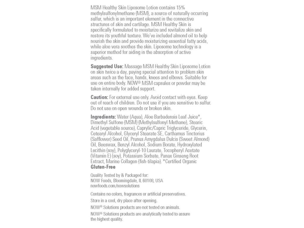 NOW® MSM Healthy Skin Liposome Lotion obsahuje 15 % methylsulfonylmethanu (MSM), zdroje přirozeně se vyskytující síry, která je důležitým prvkem v pojivových strukturách kůže a chrupavek. MSM Healthy Skin je speciálně vyvinut pro hydrataci a revitalizaci pokožky a obnovu její mladistvé struktury. Mandlový olej pomáhá vyživovat pokožku a dodává jí hydratační esenciální mastné kyseliny, zatímco aloe vera pokožku zklidňuje. Liposomová technologie je vynikající metodou, která napomáhá vstřebávání účinných látek