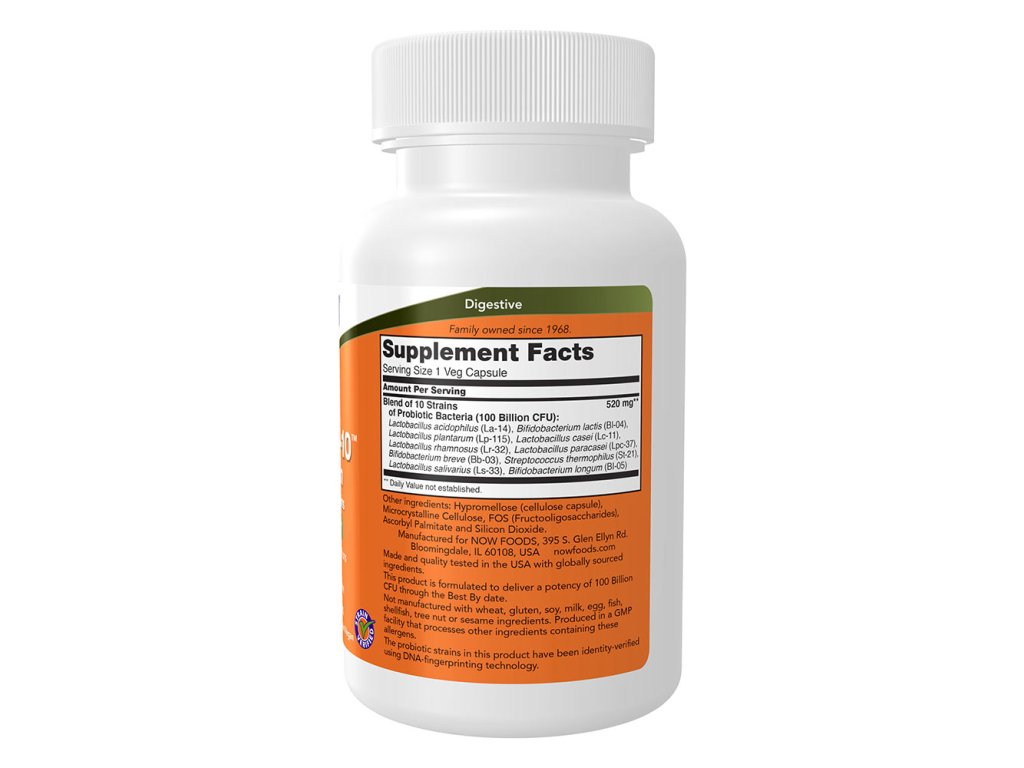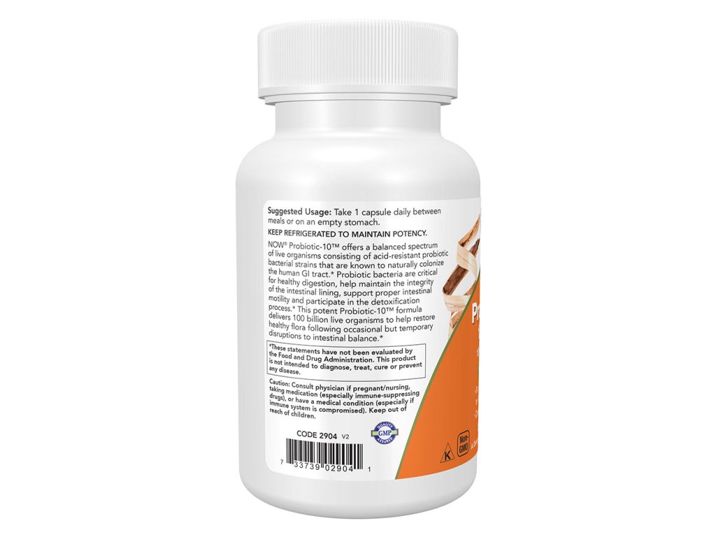 NOW® Probiotic-10™ nabízí vyvážené spektrum živých organismů složené z kyselinovzdorných probiotických bakteriálních kmenů, o kterých je známo, že přirozeně kolonizují lidský trávicí trakt. Probiotické bakterie mají zásadní význam pro zdravé trávení, pomáhají udržovat integritu střevní sliznice, podporují správnou střevní motilitu a podílejí se na detoxikačním procesu. Tento účinný přípravek Probiotic-10™ obsahuje 100 miliard živých organismů, které pomáhají obnovit zdravou flóru po občasném, ale dočasném narušení střevní rovnováhy.
