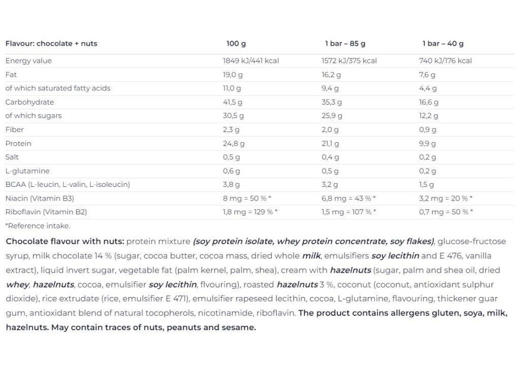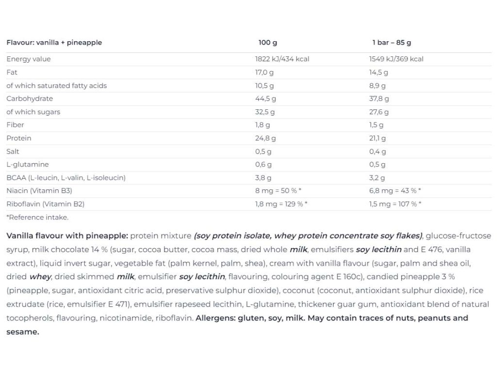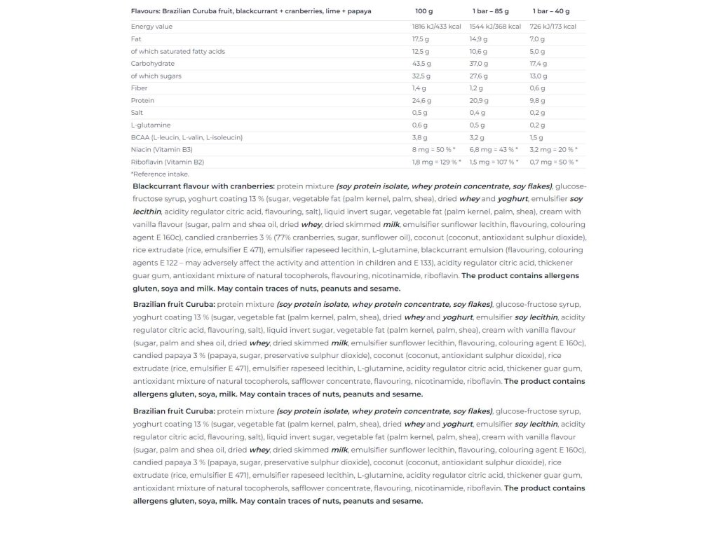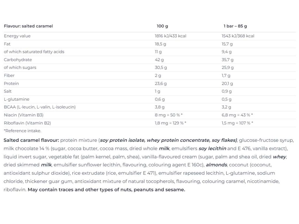 Proteinová tyčinka obohacená o vitamíny a glutamin. Není určeno pro děti, těhotné a kojící ženy. Uchovávejte mimo dosah dětí! Skladujte na suchém místě při teplotě do 25 °C a mimo dosah přímého slunečního záření. Nezamrazujte. Výrobce neodpovídá za škody způsobené nesprávným používáním nebo skladováním.Dávkování