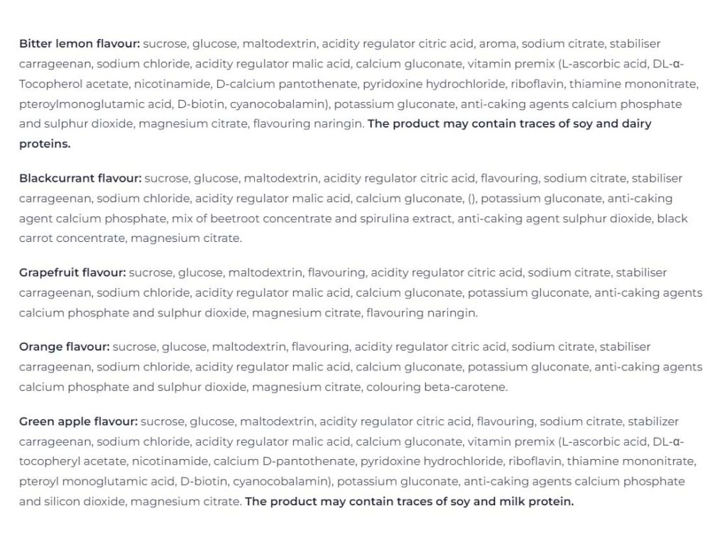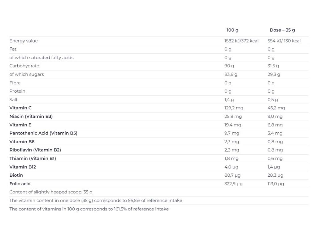 Ochucený nealkoholický obohacený nápoj s cukry a sladidly. Složení speciálně pro sportovce. Určeno pro zvláštní výživové účely. Není určeno pro děti do 3 let. Uchovávejte mimo dosah dětí!Dávkování