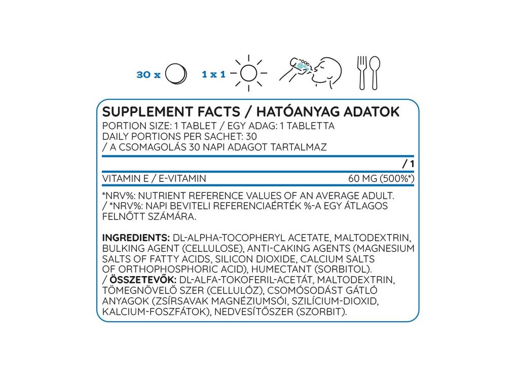Účinnou složkou tohoto produktu je vitamin E, mikroživina, která je nezbytná pro zdravé fungování našeho těla. Vitamin E je považován za velmi silný antioxidant, který přispívá k přirozené odolnosti a udržení zdraví našeho těla - proto jsme vytvořili formuli vitaminu E, která dokáže poskytnout denní dávku tohoto jedinečného mikroživinového prvku v 1 malé tabletě, což je velkorysé množství i pro sportovce nebo lidi, kteří vykonávají těžkou fyzickou práci.