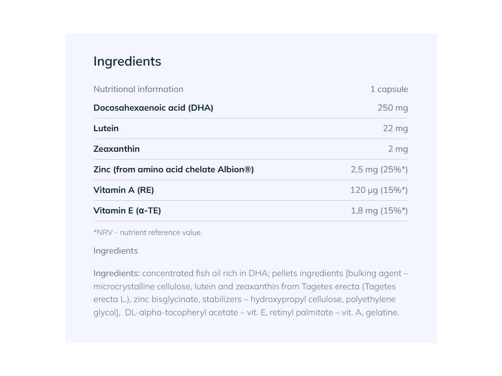 Určení: jako doplněk stravy pro dospělé osoby, které pečují o svůj zrak a chtějí doplnit svou stravu o složky napomáhající udržení správného vidění. Přípravek se doporučuje zejména lidem, kteří vykonávají práci při umělém osvětlení, kancelářské práce, jsou vystaveni intenzivnímu slunečnímu záření, pociťují únavu očí a nepříjemné pocity způsobené slzením, zarudnutím a přecitlivělostí na světlo, dále lidem středního a staršího věku, kteří si chtějí udržet dobrý zrak.