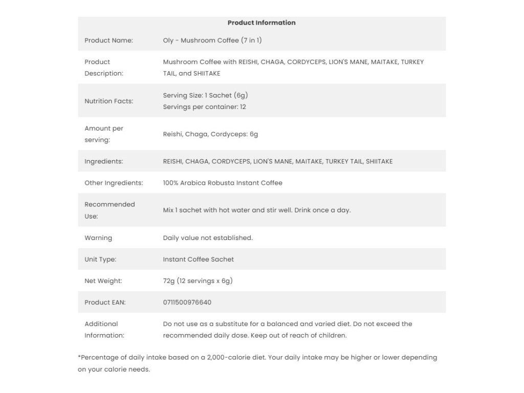 Oly - Houbová káva (7 v 1) nabízí směs hub, jako jsou Reishi, Chaga a Turkey Tail. Tyto houby jsou tradičně ceněny pro své přírodní vlastnosti a dodávají každému šálku jedinečný a výživný zážitek.