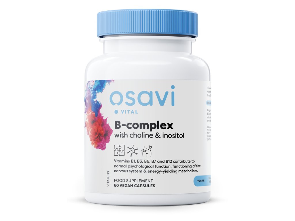 Osavi Complex-B with Choline and Inositol je doplněk stravy ve formě tvrdých vegetariánských kapslí. Obsahuje komplex 8 vitamínů skupiny B, obohacený o cholin (VitaCholine®) a inositol, známý také jako vitamín B8. Vitamíny skupiny B jsou klíčové pro celkové zdraví a psychickou pohodu.