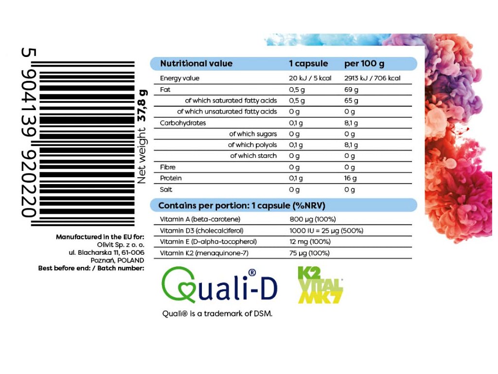 Pestrá a zdravá strava je prvním a nejdůležitějším krokem ke zvýšení příjmu ADEK . I tak může být někdy obtížné získat vše potřebné pouze ze stravy. Stává se, že jídlo nepokryje celou potřebu těchto vitaminů a v těle se začne projevovat jejich nedostatek. Tyto základní živiny můžete posílit pomocí doplňku stravy ADEK. Nabízíme vám doplněk stravy vynikající kvality obsahující přírodní beta-karoten, cholekalciferol, D-alfa-tokoferol a menachinon-7, který pokrývá denní potřebu těchto vitaminů.
