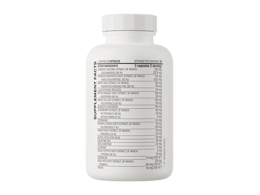 Přípravek OstroVit 17 Antioxidanty je bohatstvím biologicky aktivních látek. Ve výrobku najdete řadu extraktů standardizovaných na určitý obsah účinných látek, což zaručuje vysoký obsah cenných látek v každé části výrobku a pozitivně ovlivňuje kvalitu doplňku stravy. OstroVit 17 Antioxidanty obsahuje:- Extrakt z oddenku kurkumy standardizovaný na 95 % kurkuminoidů,