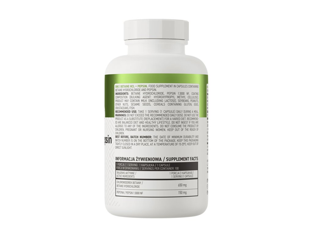 OstroVit Betaine HCl + Pepsin je doplněk stravy, který je zdrojem pepsinu a hydrochloridu betainu. Tento přípravek je k dispozici ve formě snadno polykatelných kapslí, vytvořených pro lidi, kteří chtějí doplnit svou stravu o cenné složky.
