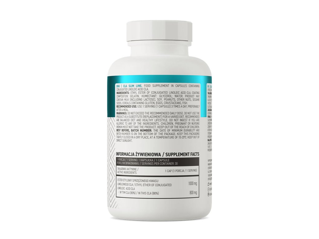Konjugovaná kyselina linolová má podpůrný účinek na růst svalové hmoty a pomáhá spalovat nadměrnou tukovou tkáň. CLA je velmi silný antioxidant - vykazuje asi 100krát vyšší antioxidační aktivitu než vitamin E, díky čemuž pomáhá potlačovat tvorbu volných radikálů a zpomaluje stárnutí organismu. Kromě toho CLA zlepšuje mineralizaci kostí a má schopnost normalizovat hladinu glukózy v krviVlastnosti složek obsažených v přípravku OstroVit CLA Slim Line