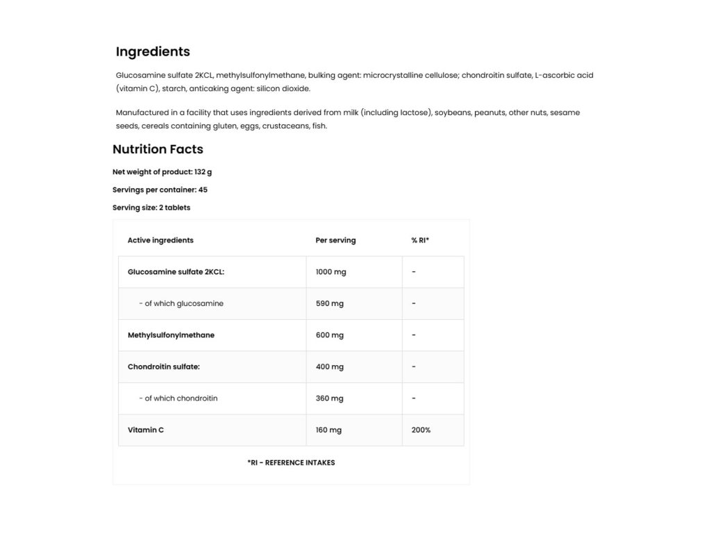 Glukosamin je organická chemická sloučenina, která je aminosloučeninou glukózy, přirozeně se vyskytující v mnoha tkáních lidského těla. V těle se syntetizuje pouze v malém množství a schopnost jeho tvorby s věkem klesá. Tuto složku lze přijímat potravou nebo ve formě doplňků stravy.MSM, neboli methylsulfonylmethan, je organická sloučenina obsahující síru, která se v každodenní stravě nachází v mléce a mléčných výrobcích, vejcích, ovoci, zelenině a celozrnných obilovinách. MSM je velmi citlivá látka, která se snadno rozkládá tepelným zpracováním, pasterizací nebo mražením. Proto může být vhodné tuto látku do těla dodávat prostřednictvím suplementace.
