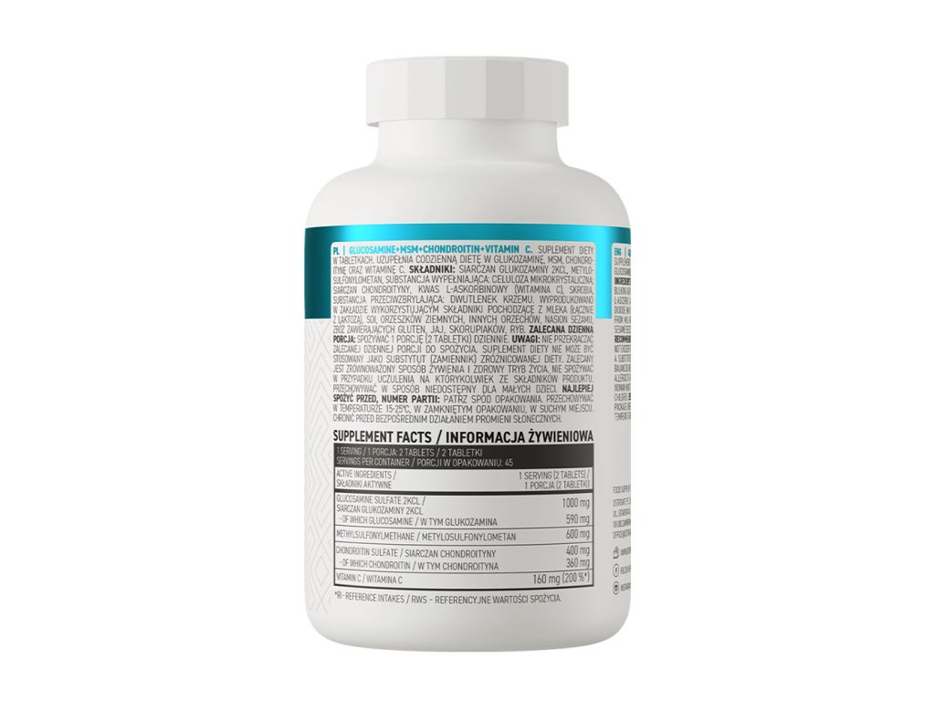 OstroVit Glukosamin MSM Chondroitin Vitamin C je komplexní doplněk stravy, který je zdrojem cenných složek – přípravek obsahuje mimo jiné glukosamin, chondroitin a vitamin C. Jedná se o produkt ve formě snadno polykatelných tablet, vytvořený pro osoby, které chtějí doplnit svůj každodenní jídelníček o cenné látky.- Zdroj mnoha cenných látek – jedna dávka doplňku dodává tělu 1000 mg glukosamin sulfátu, 600 mg methylsulfonylmethanu, 400 mg chondroitin sulfátu a 160 mg vitaminu C.