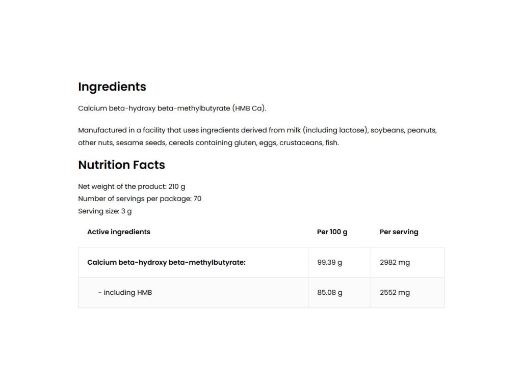 - Zdroj HMB - jedna porce doplňku stravy dodává tělu 2982 mg beta-hydroxy-beta-methylbutyrátu vápenatého