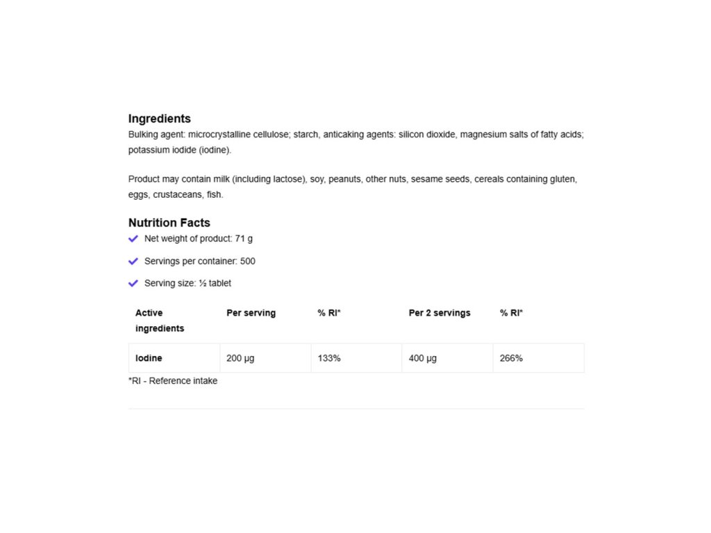 - Vysoký příjem jódu: Jedna dávka (půl tablety) obsahuje 200 mikrogramů jódu, což je 133 % denní doporučené dávky.