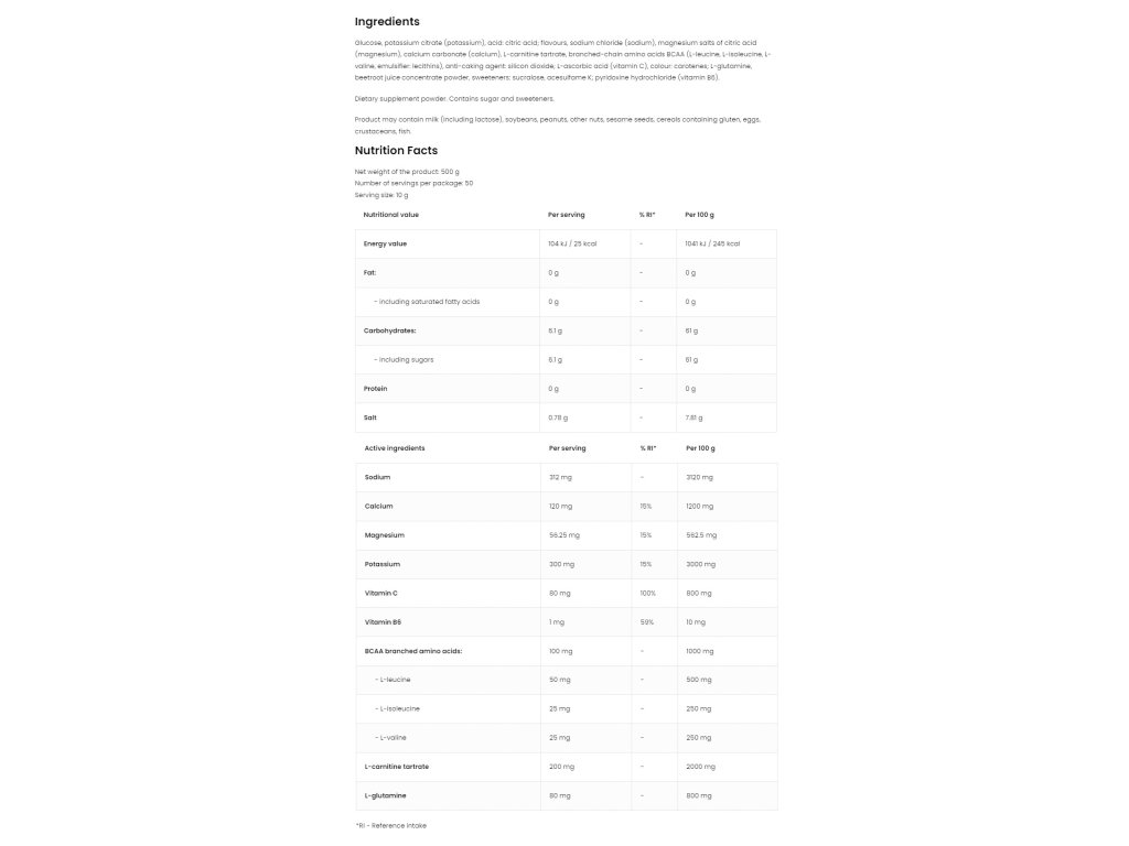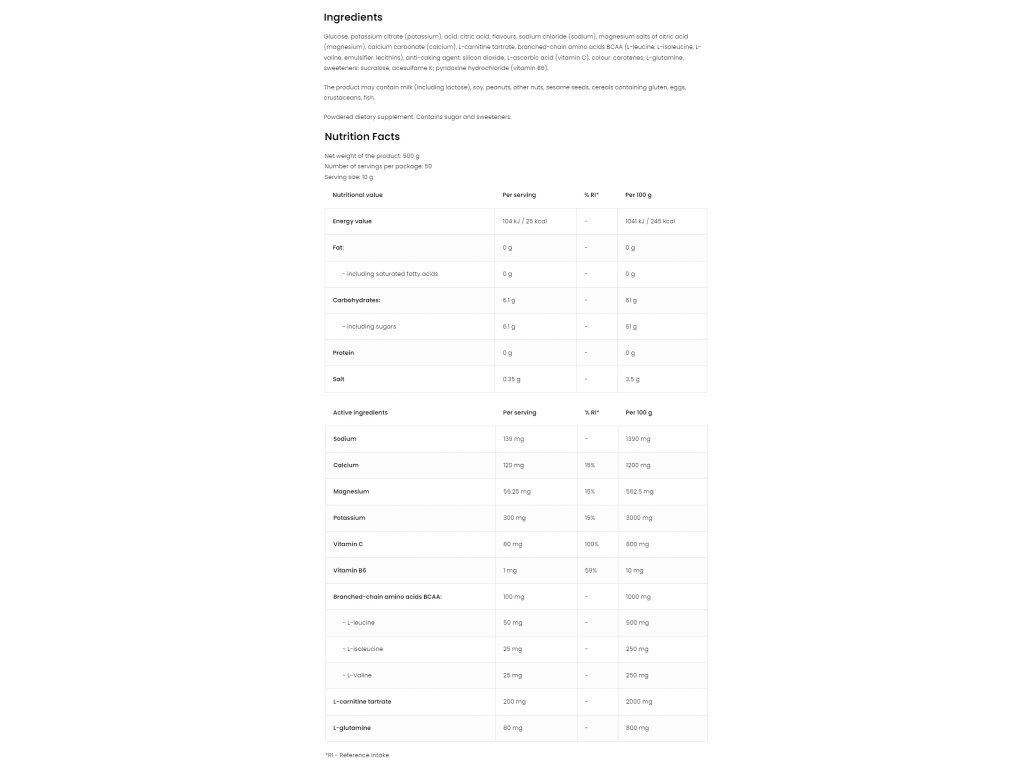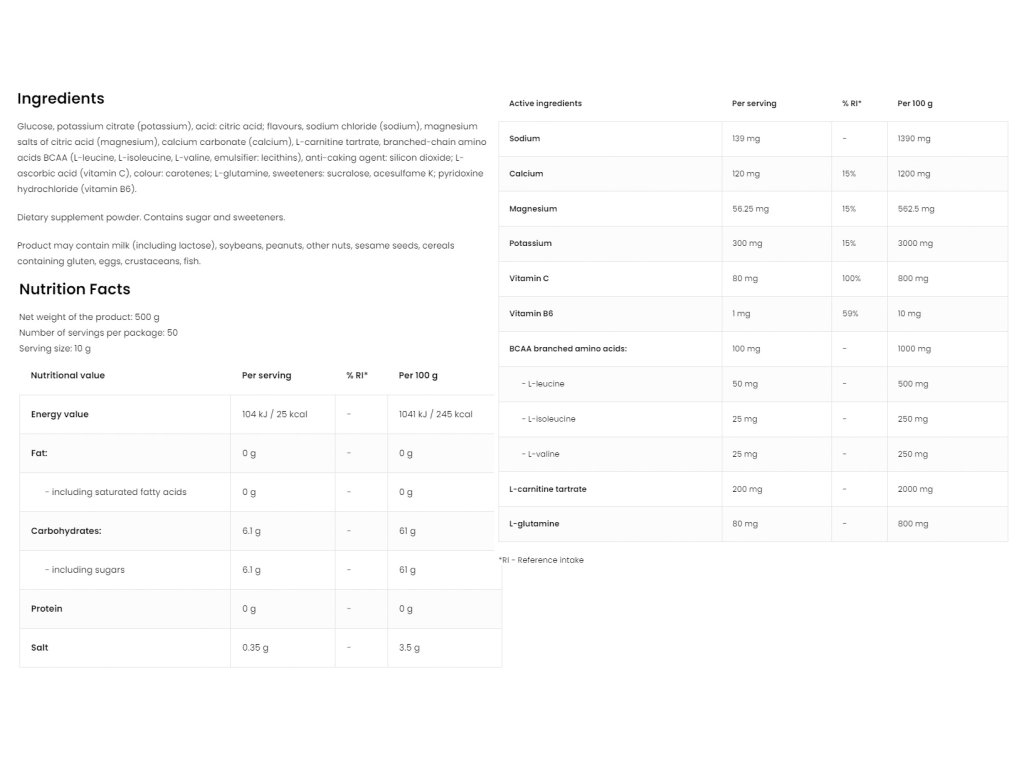- Bohatý na elektrolyty a cenné živiny - Jedna porce doplňku stravy dodá tělu 139 mg sodíku, 120 mg vápníku, 56,25 mg hořčíku, 300 mg draslíku a také 80 mg vitaminu C a 1 mg vitaminu B6. Přípravek navíc obsahuje 100 mg BCAA, 200 mg L-karnitin tartrátu a 80 mg L-glutaminu.