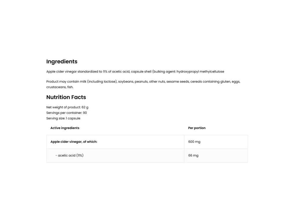- VELKÉ MNOŽSTVÍ KYSELINY OCETOVÉ - Stanovené množství kyseliny octové v kapsli vám umožní plně ocenit cenné vlastnosti jablečného octa. Jedna denní dávka našeho doplňku obsahuje až 66 mg této cenné složky!