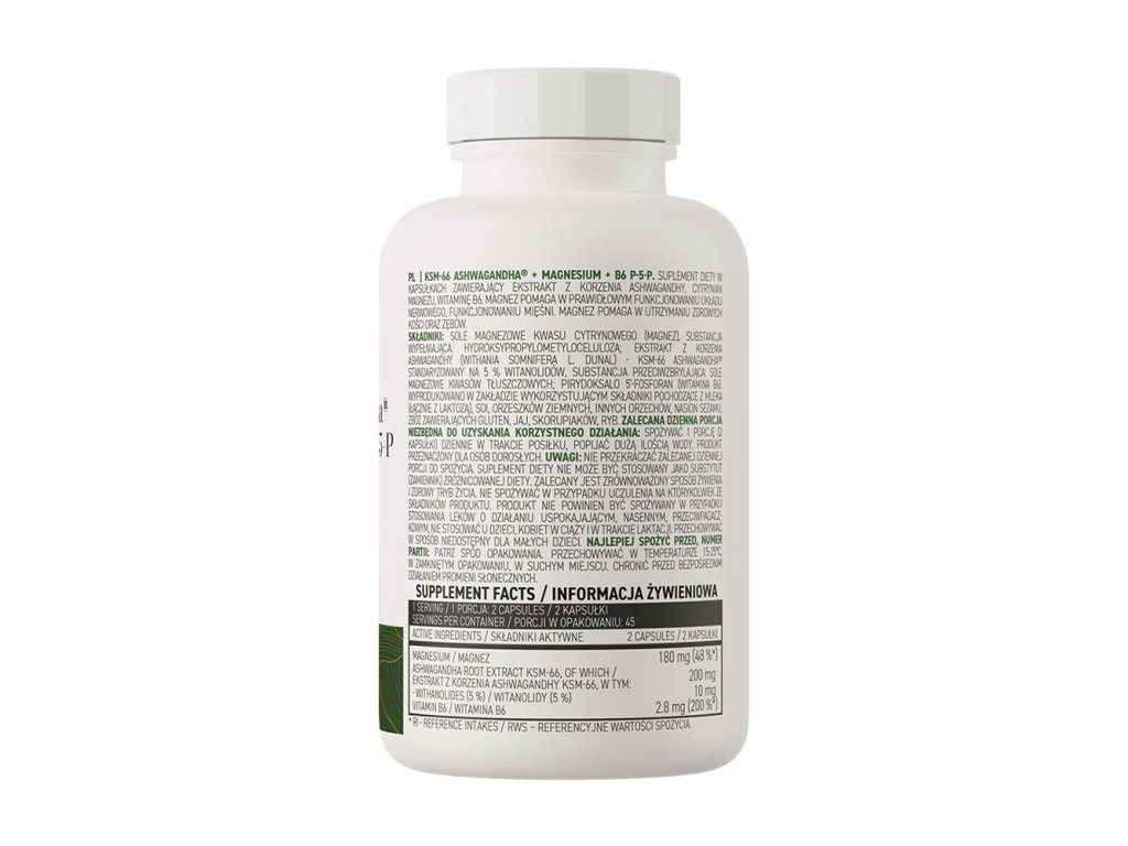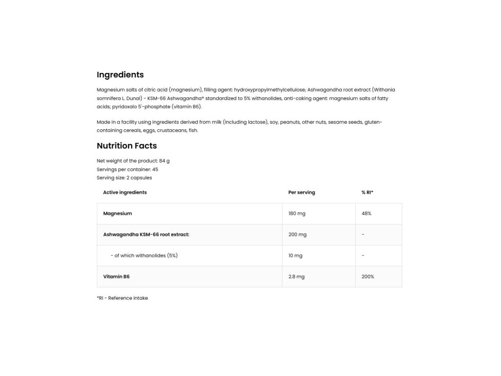 - Zdroj cenných látek - jedna dávka doplňku stravy dodává tělu 180 mg hořčíku, 200 mg extraktu z kořene ashwagandhy KSM-66 standardizovaného na 5 % withanolidů a 2,8 mg vitaminu B6 P-5-P