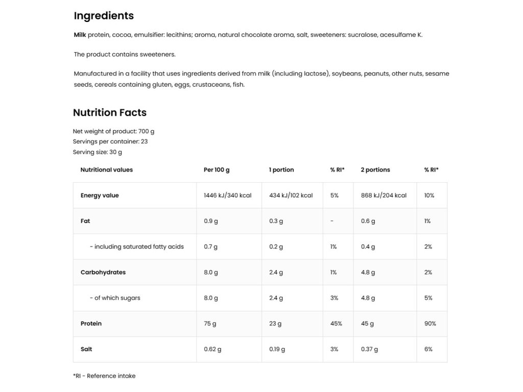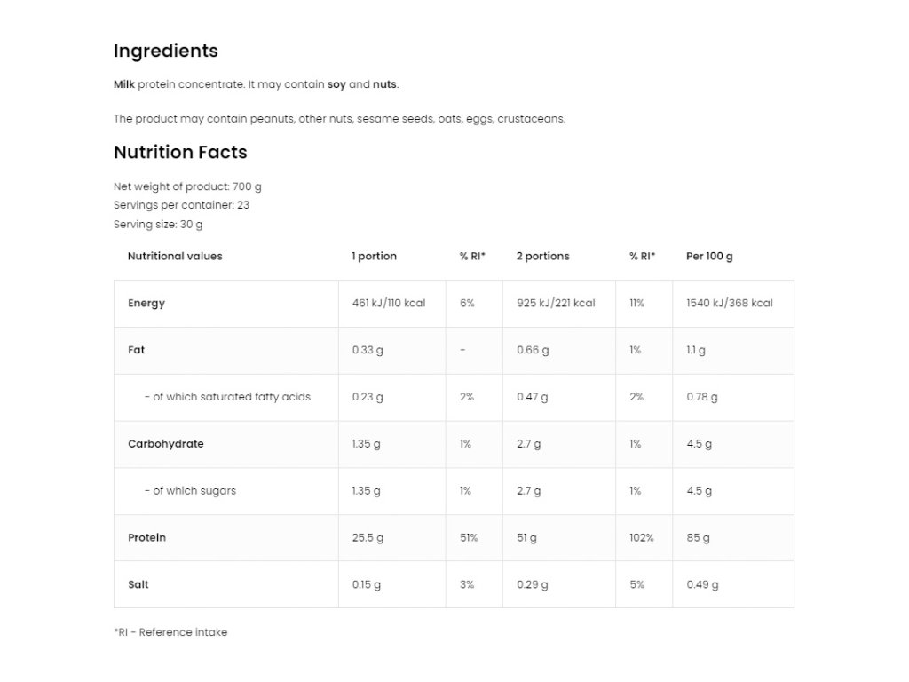Přidejte 30 g (3 odměrky) do 200 ml odtučněného mléka nebo vody. Konzumujte 1-2krát denně v závislosti na vašich potřebách.Skladování