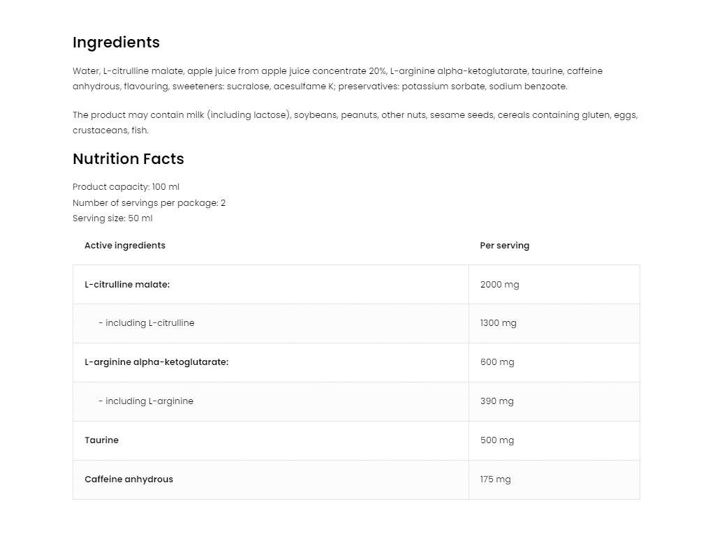 - Zdroj cenných látek - Jedna porce doplňku stravy dodává tělu 2000 mg L-citrulin malátu, 600 mg L-arginin alfa-ketoglutarátu, dále 500 mg taurinu a 175 mg bezvodého kofeinu.