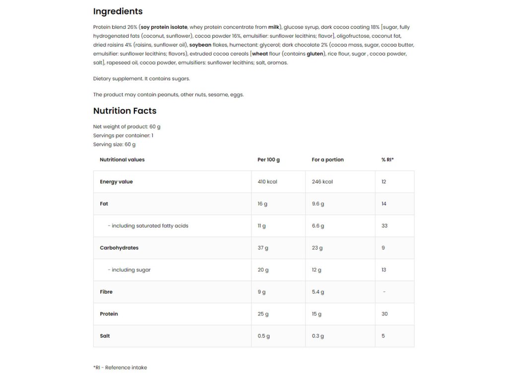 OstroVit THE BAR. je skutečným zážitkem pro každého. Jste nenasytní a milujete sladkosti? Nemohli byste chvíli vydržet, aniž byste mysleli na sladkosti, které jsou celým vaším životem? Nebo je pro vás důležitá vyvážená strava, kde je důležitý vysoký přísun bílkovin a nemůžete si dovolit naplnit kalorickou bilanci pouze "prázdnými" kaloriemi? OstroVit BAR. je nejen vynikající chutí, ale také zdrojem cenných bílkovin. Společnost OstroVit vytvořila proteinovou tyčinku, která spojuje milovníky svačin a sportovní nadšence, u nichž je vysoký přísun bílkovin tak žádoucí. Zapomeňte na ošizená jídla! Chytit OstroVit THE BAR. v ruce a sníst ho s vědomím, že jste udělali správnou věc. OstroVit BAR. je to náhrada jídla, kterou můžete jíst kdykoli a kdekoli chcete!Vlastnosti: